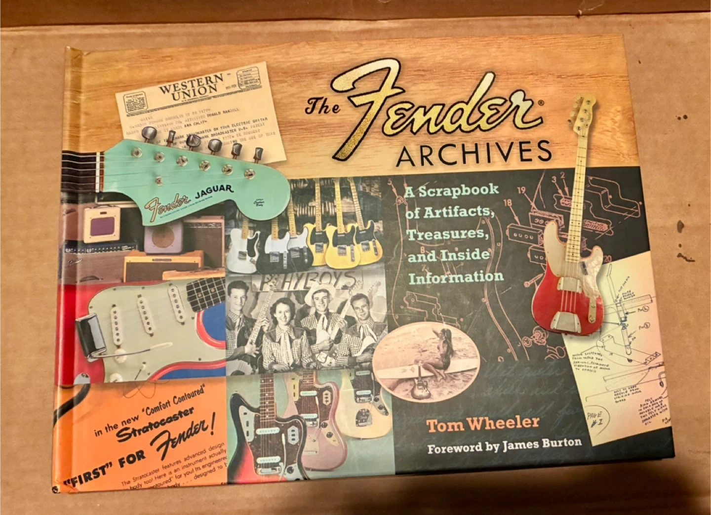 This is a scrapbook about Fender guitars, featuring artifacts and inside information. It covers models like the Stratocaster and Jaguar. Written by Tom Wheeler with a foreword by James Burton. All pieces accounted for.