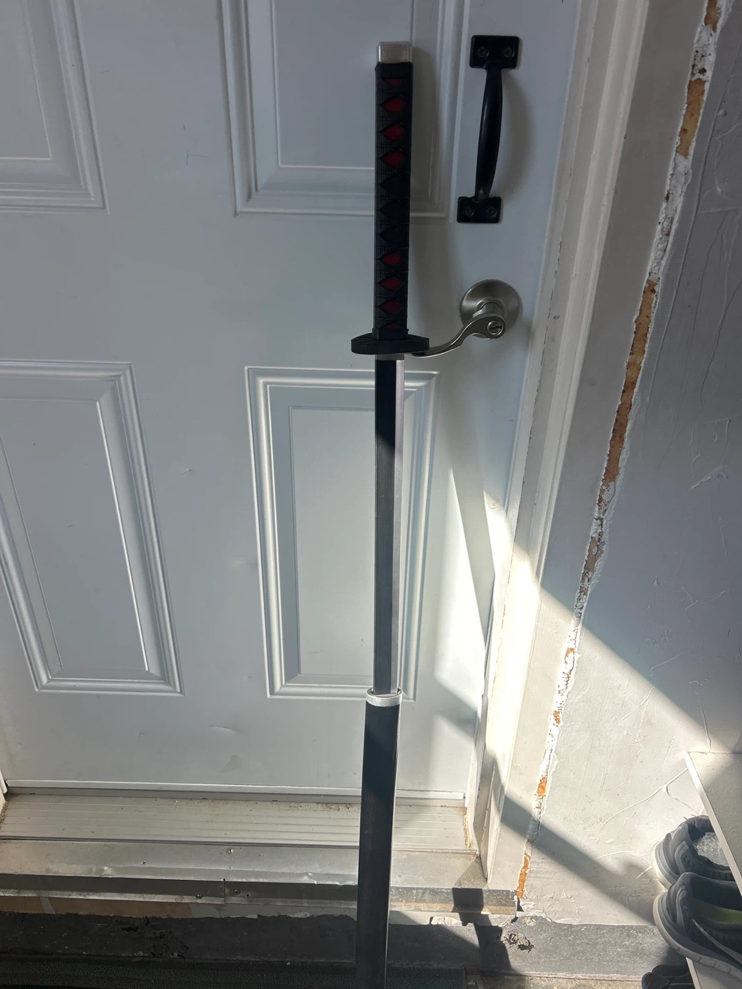 This is a decorative katana with a black handle wrapped in red diamond pattern. It has a silver-coloured pommel and a silver ring near the base of the blade.