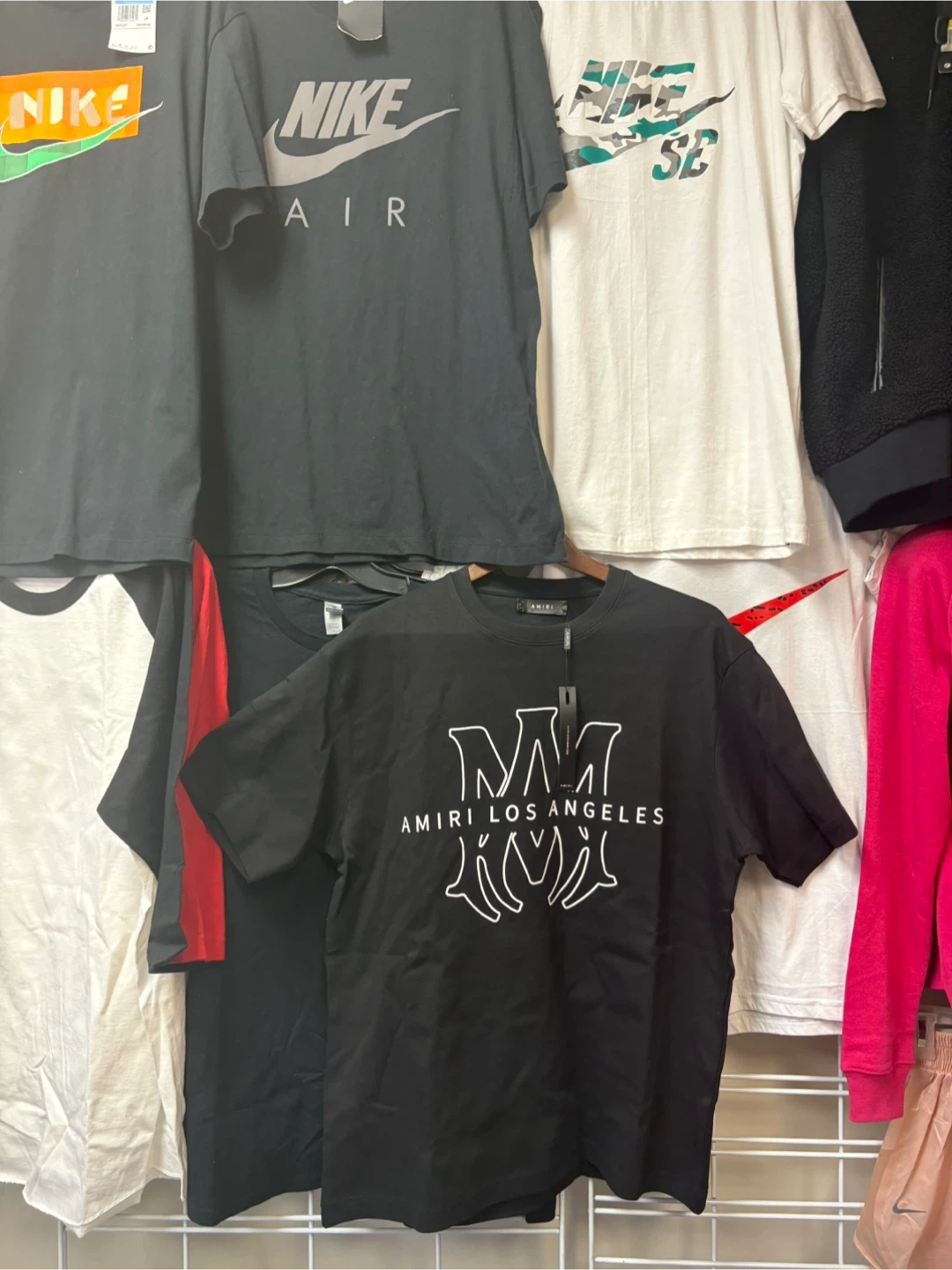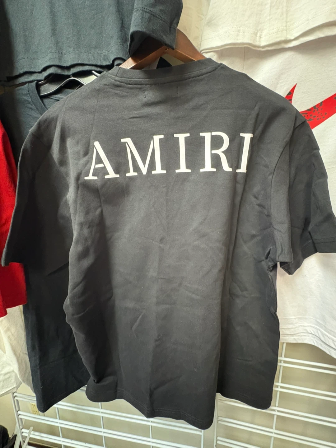 Black cotton t-shirt with AMIRI Los Angeles graphic on the front and large AMIRI text on the back. Crew neck, short sleeves. Made with high-quality fabric for comfort.