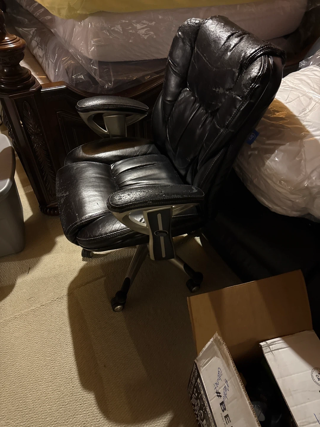 Selling a black office desk and a black leather office chair. Both items show signs of wear and tear. Great for someone looking for functional furniture at a budget-friendly price!