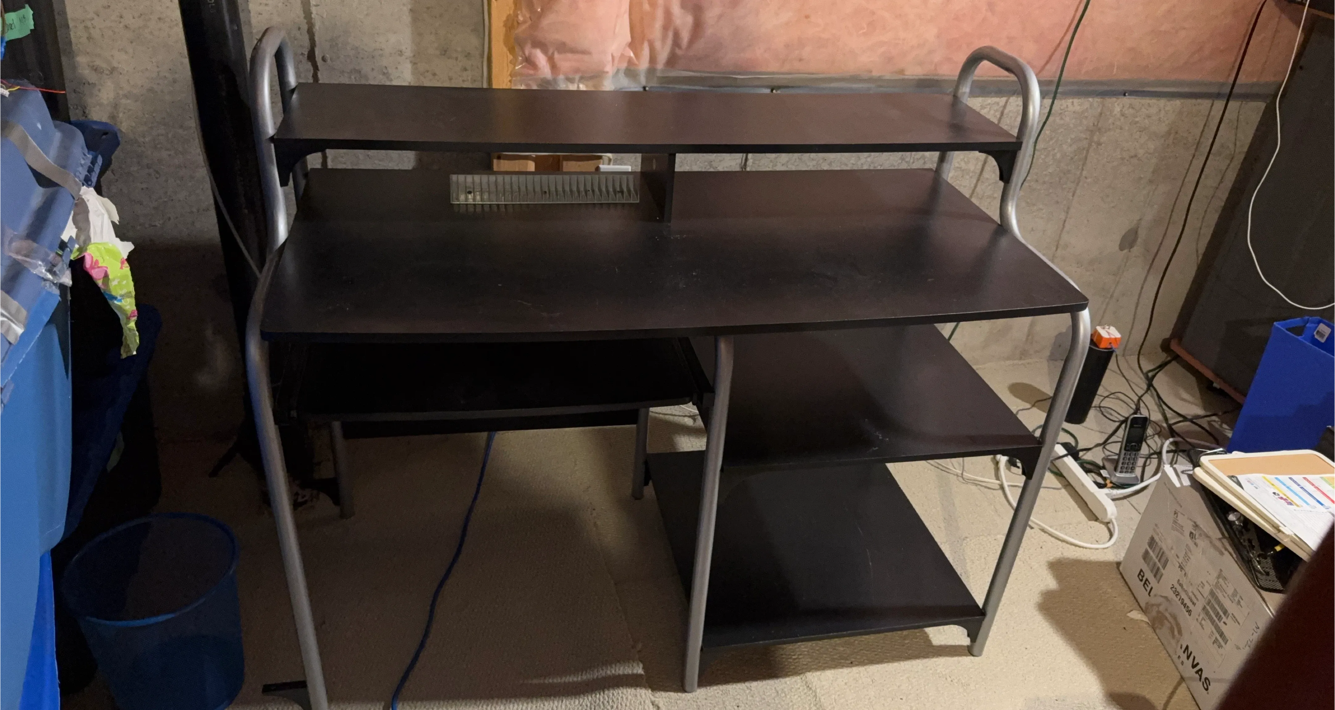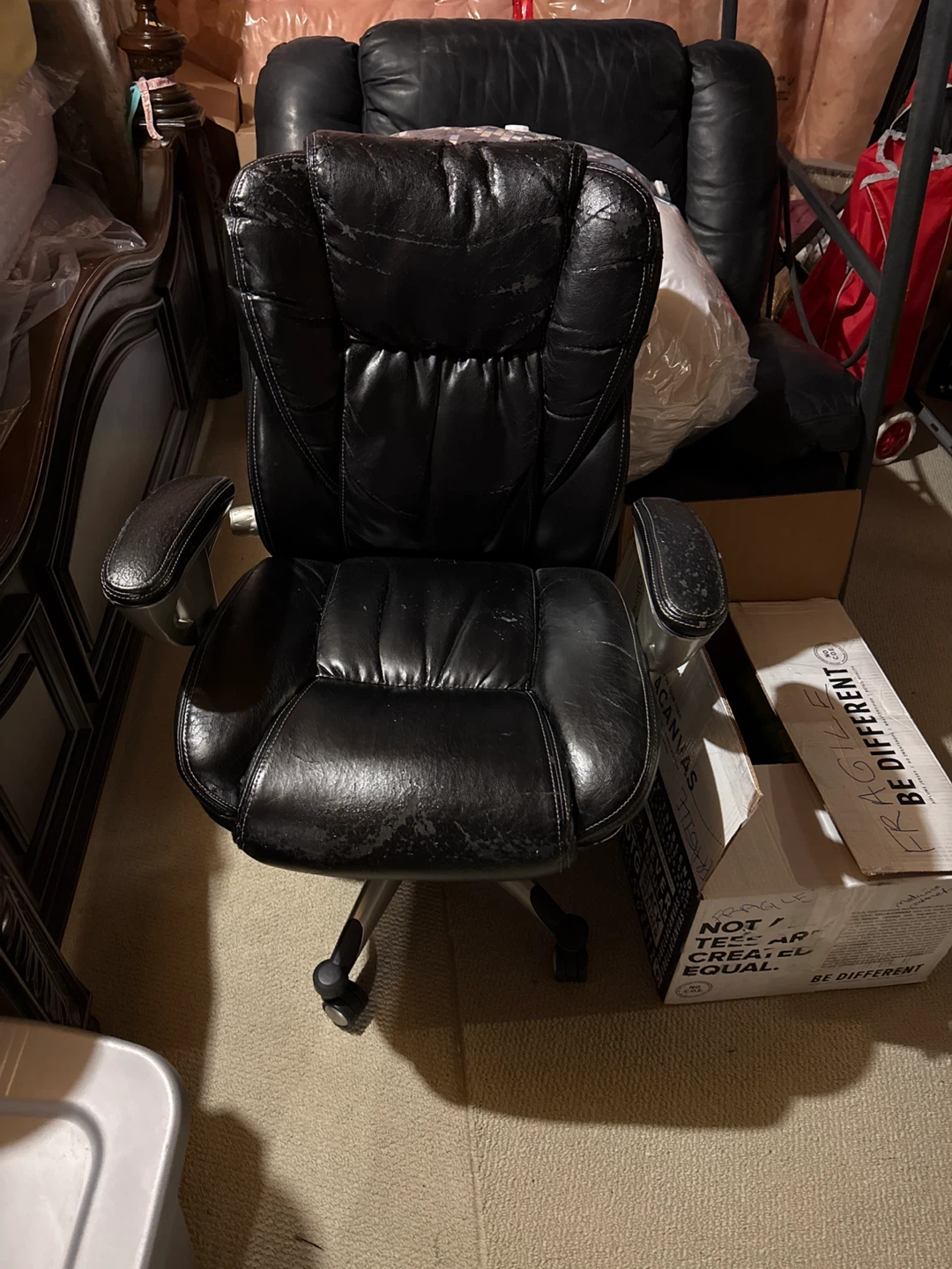 Selling a black office desk and a black leather office chair. Both items show signs of wear and tear. Great for someone looking for functional furniture at a budget-friendly price!