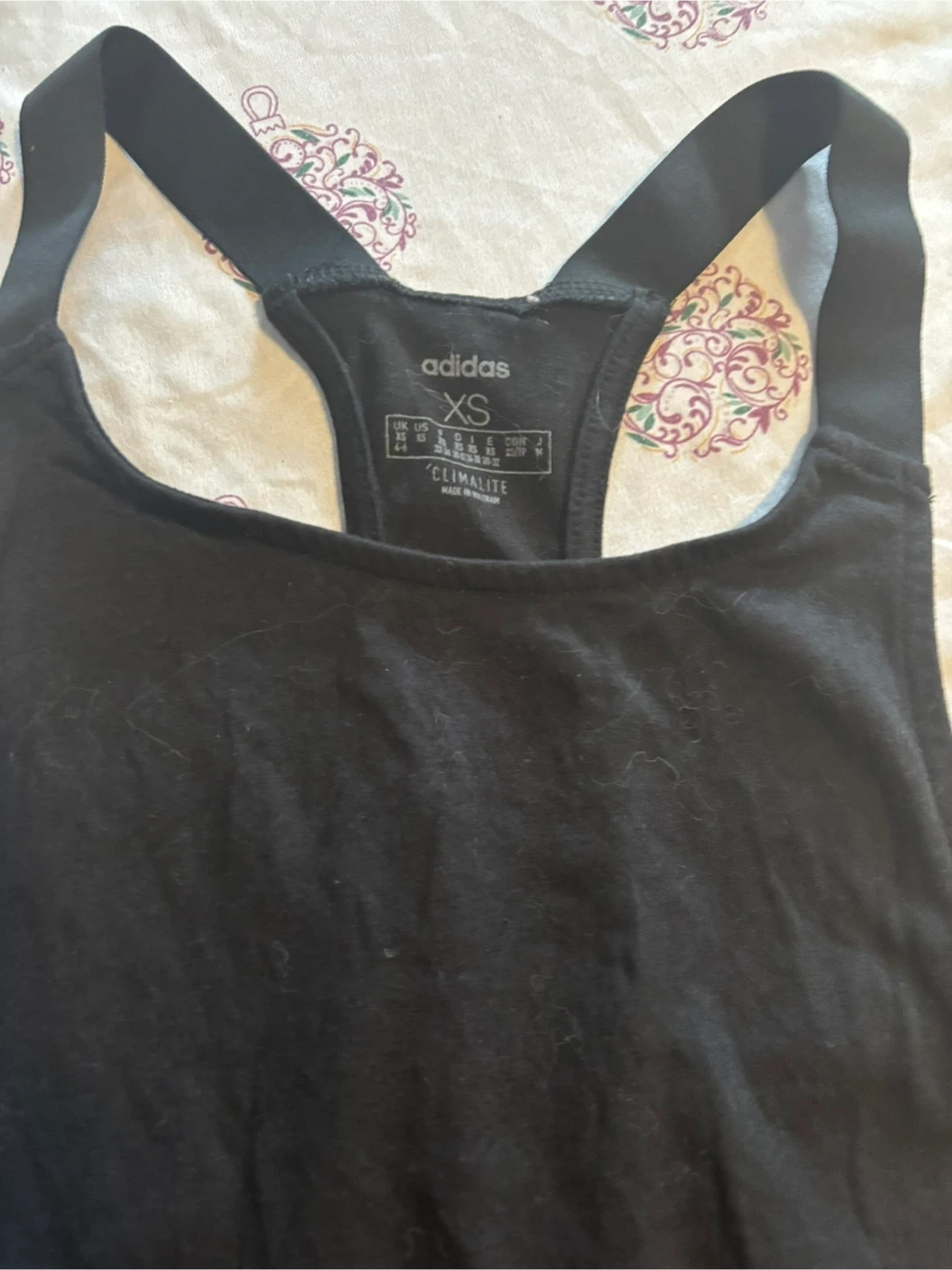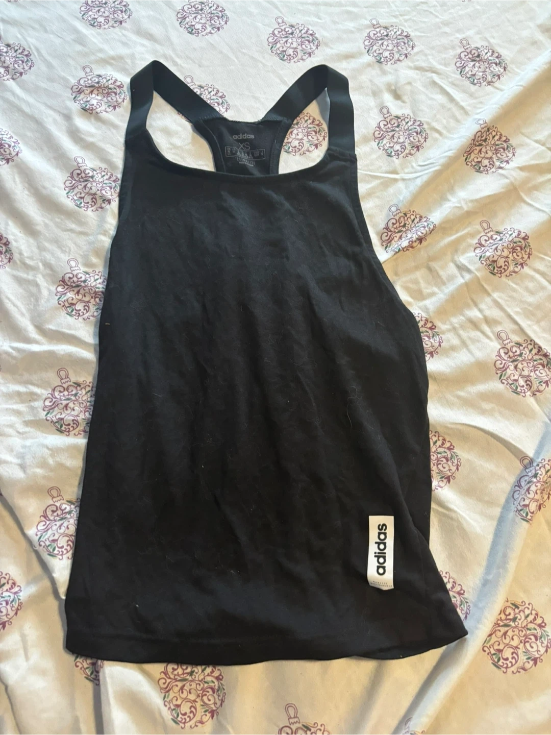 Selling an Adidas racerback tank top in size XS. It's black and features Climalite fabric, perfect for workouts or everyday wear!