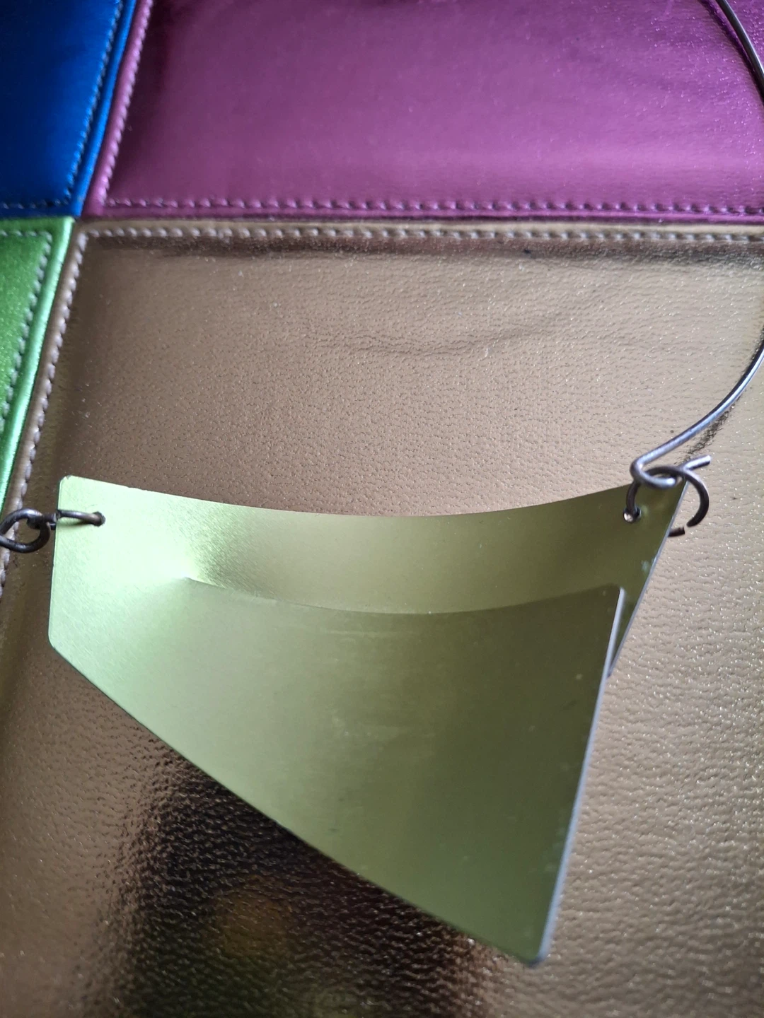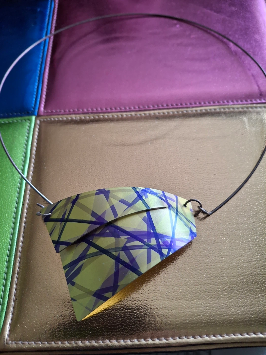 Metal choker necklace. 6.25” and 8” down. Light lime green with purple line accents. Features a hook so it’s easy to put on and remove.