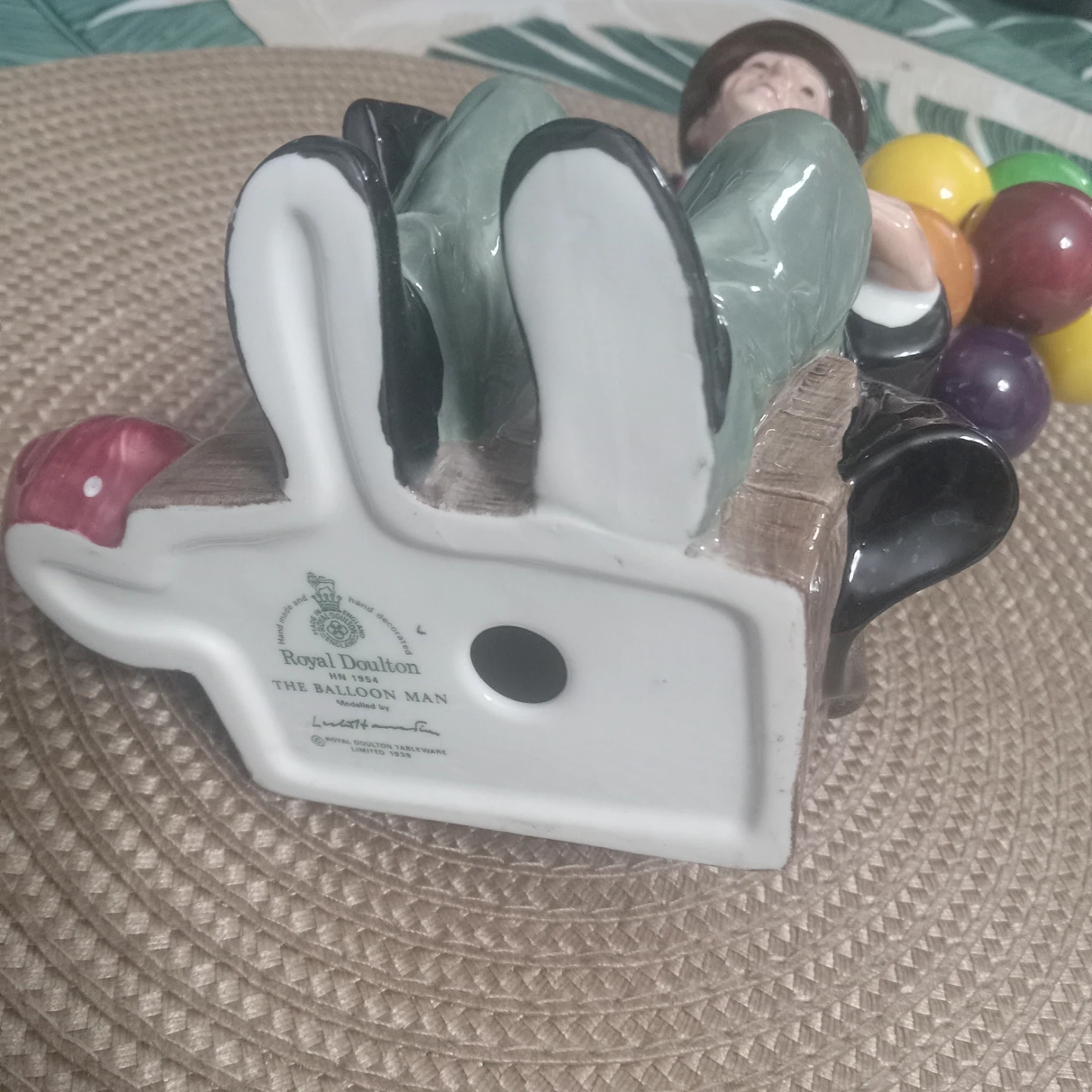 This is a Royal Doulton figurine titled 'The Balloon Man'. It's made of porcelain and depicts a man holding a bunch of colourful balloons. It's a lovely decorative piece.