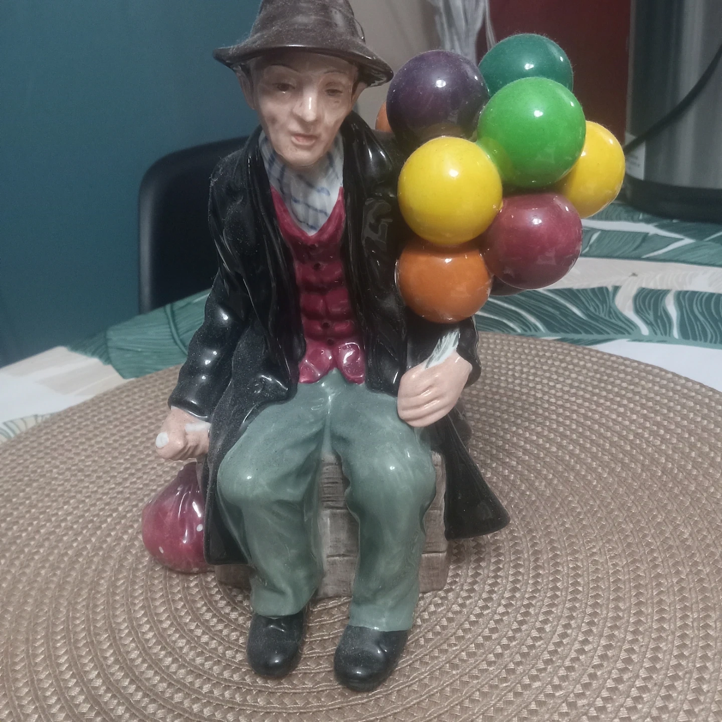 This is a Royal Doulton figurine titled 'The Balloon Man'. It's made of porcelain and depicts a man holding a bunch of colourful balloons. It's a lovely decorative piece.