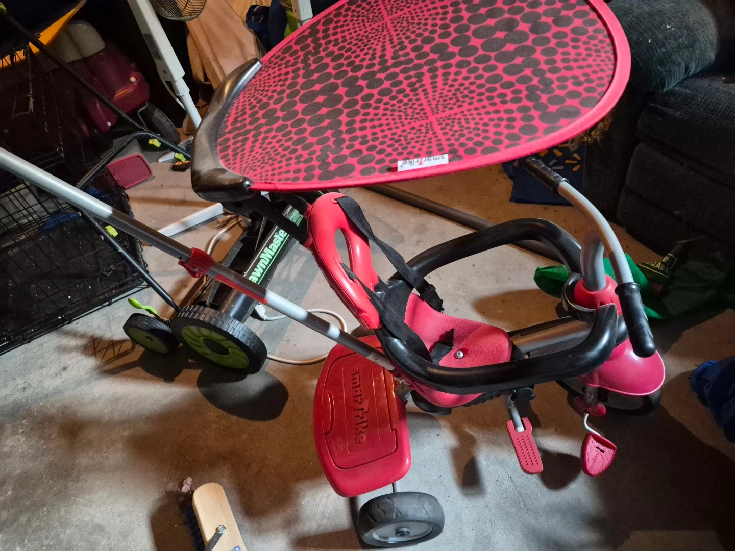 Red tricycle from Smartrike. It features a parent push handle, safety straps, and a sun canopy with a polka dot pattern. Footrests are also included.
