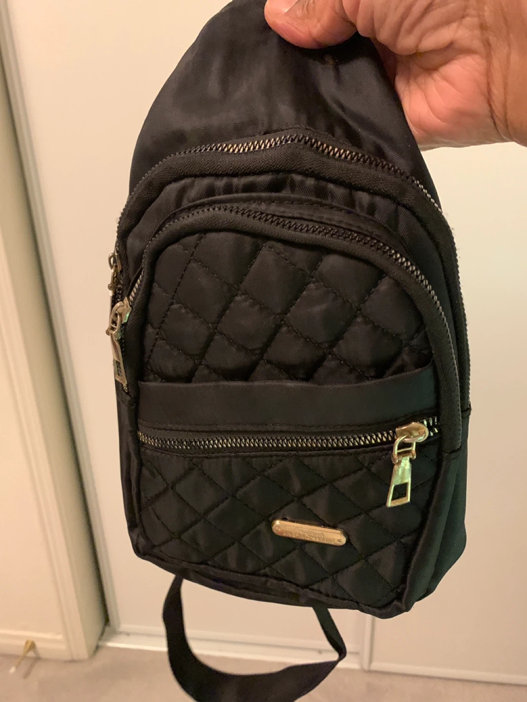 This black sling bag features a quilted front with multiple zippered compartments. It's made of nylon material. Measures approximately 12 inches tall and 8 inches wide.