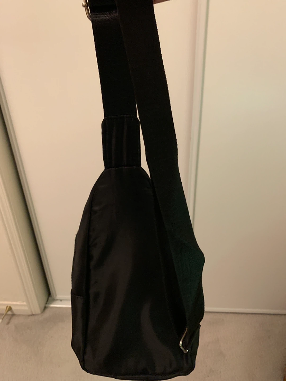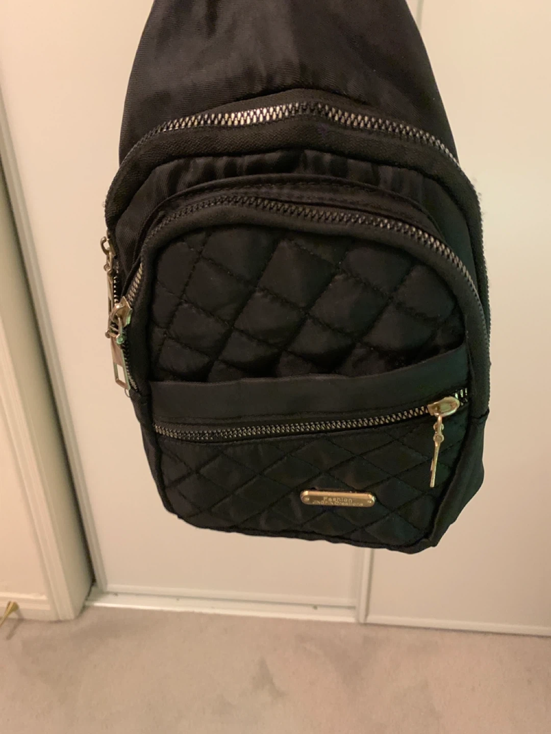 This black sling bag features a quilted front with multiple zippered compartments. It's made of nylon material. Measures approximately 12 inches tall and 8 inches wide.