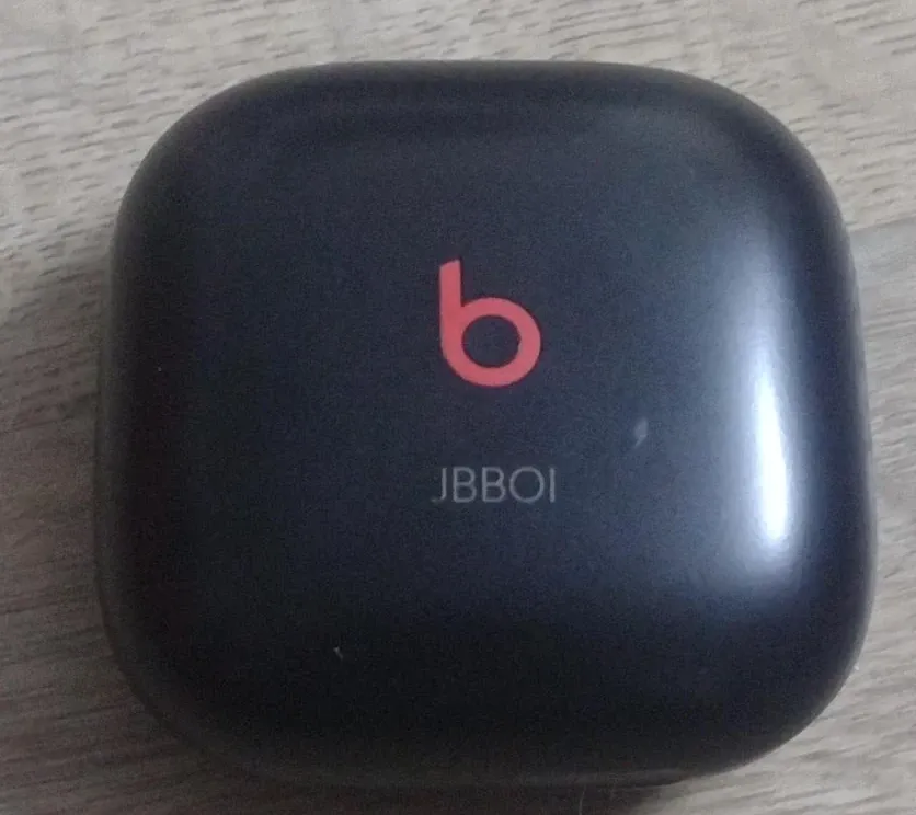 This is a black charging case for Beats earbuds. It features the "b" logo in red. The model identifier JBBOI is printed on the case. It's a portable charging solution.