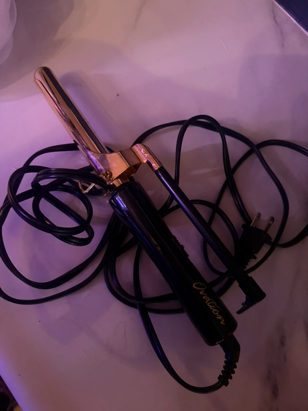 Ovation Marcel iron with a gold-coated barrel. It's got quick even heating and a 3-position switch. Includes a 10 ft. rotating swivel cord.