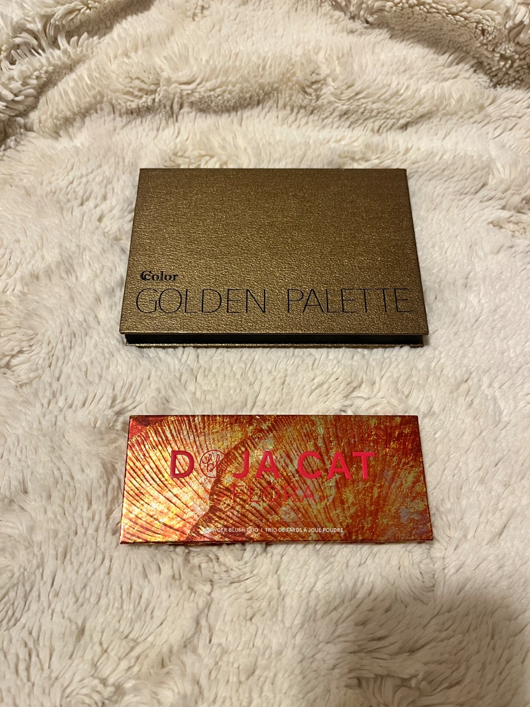 This listing includes a Golden Palette eyeshadow palette with 15 shades and a Doja Cat x BH Cosmetics blush trio. The blush trio contains three warm-toned shades.