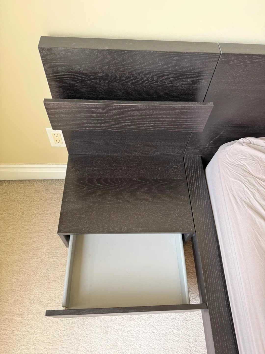 Classic bed frame in a dark oak finish. It features two attached nightstands, each with a shelf and a drawer for storage. Will need to disassemble, no delivery.