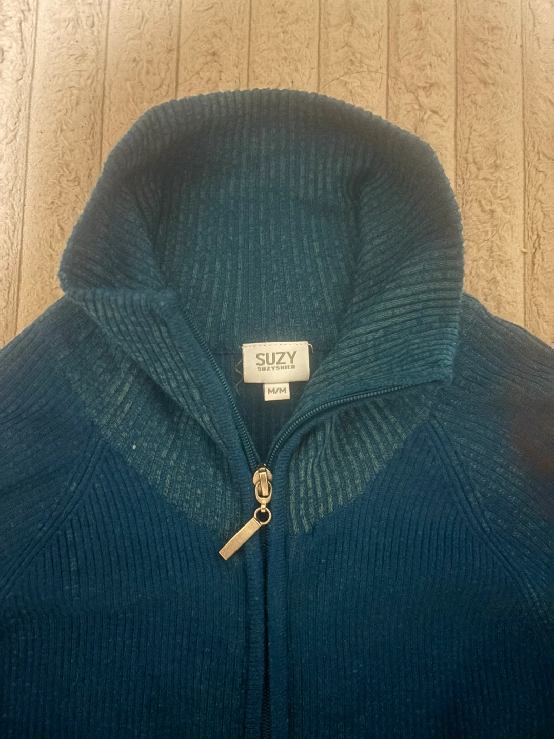 Teal zip-up cardigan from Suzy Shier. Ribbed knit texture with a stand-up collar. Size M/M. Perfect condition.