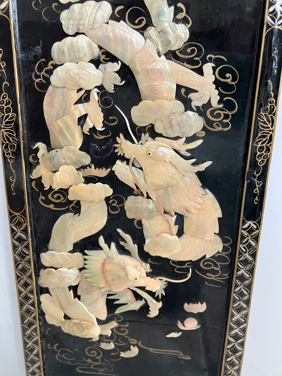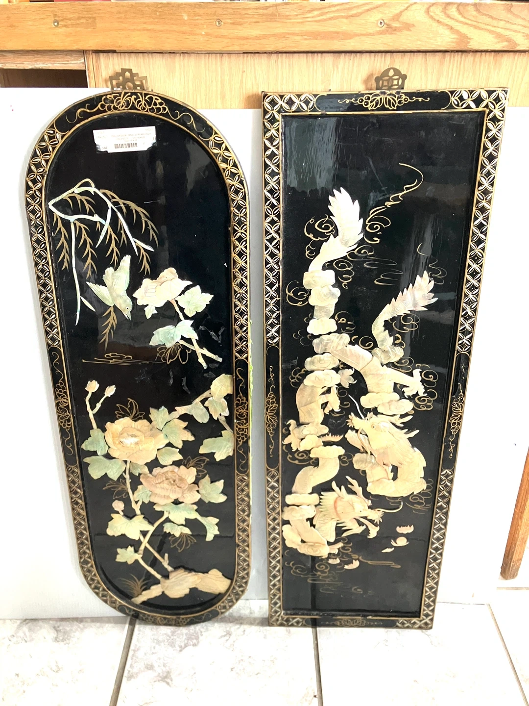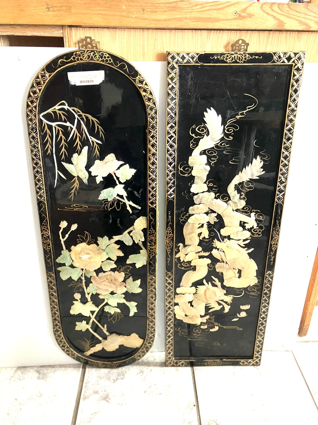 Set of two Chinese black lacquered panel with mother of pearl intricate raised design set