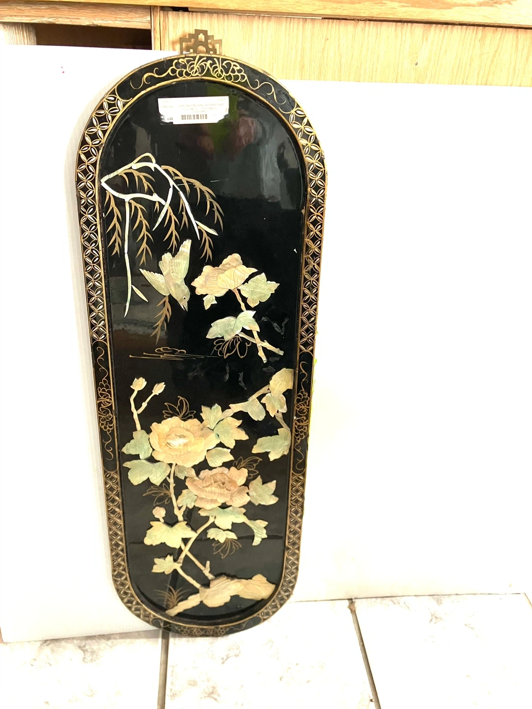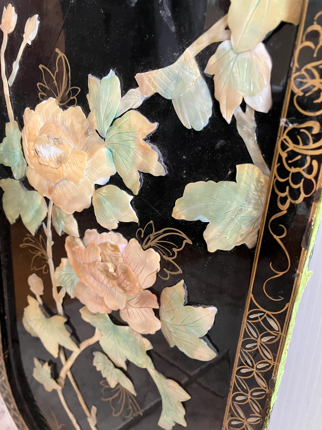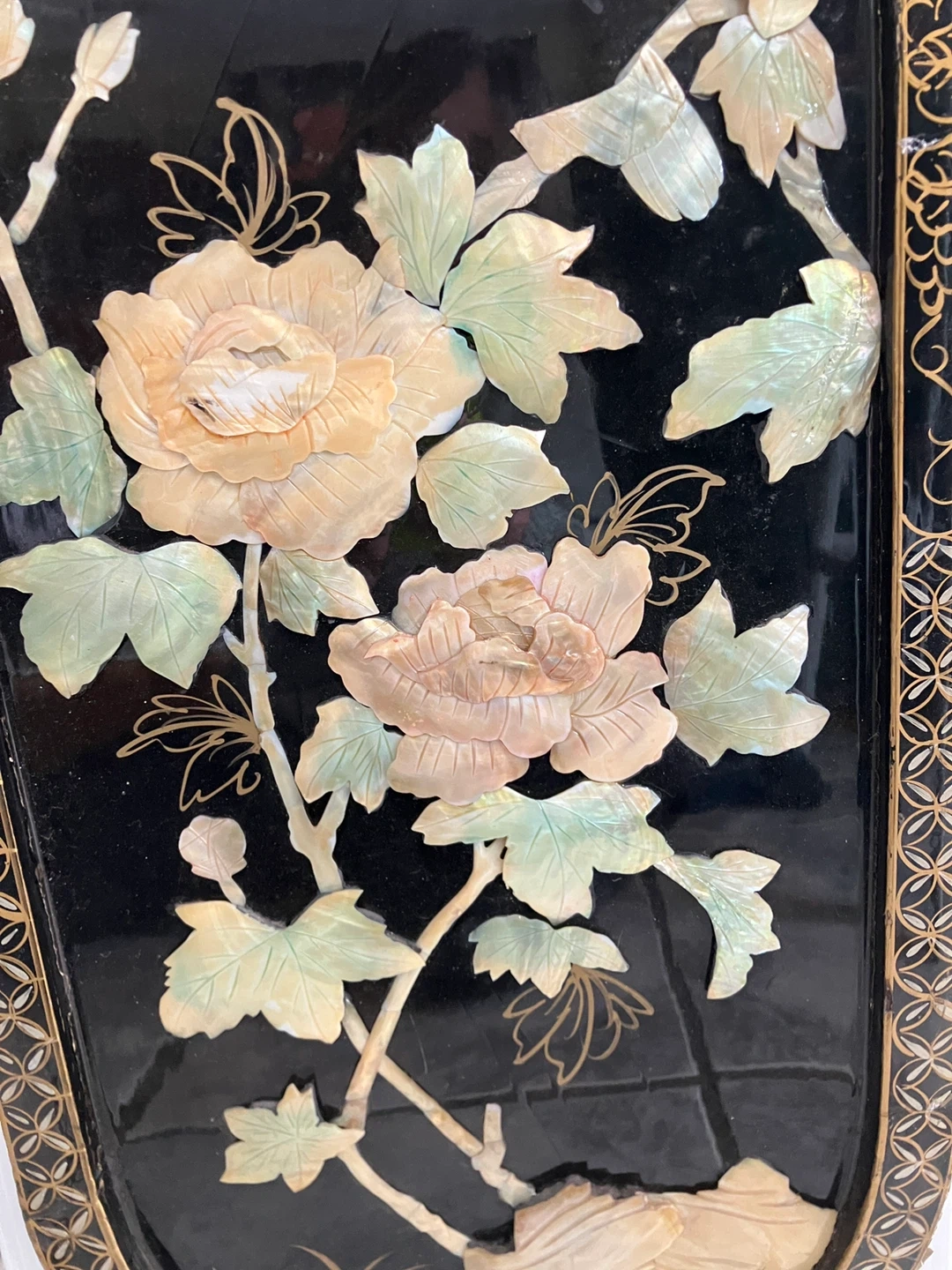Set of two Chinese black lacquered panel with mother of pearl intricate raised design set