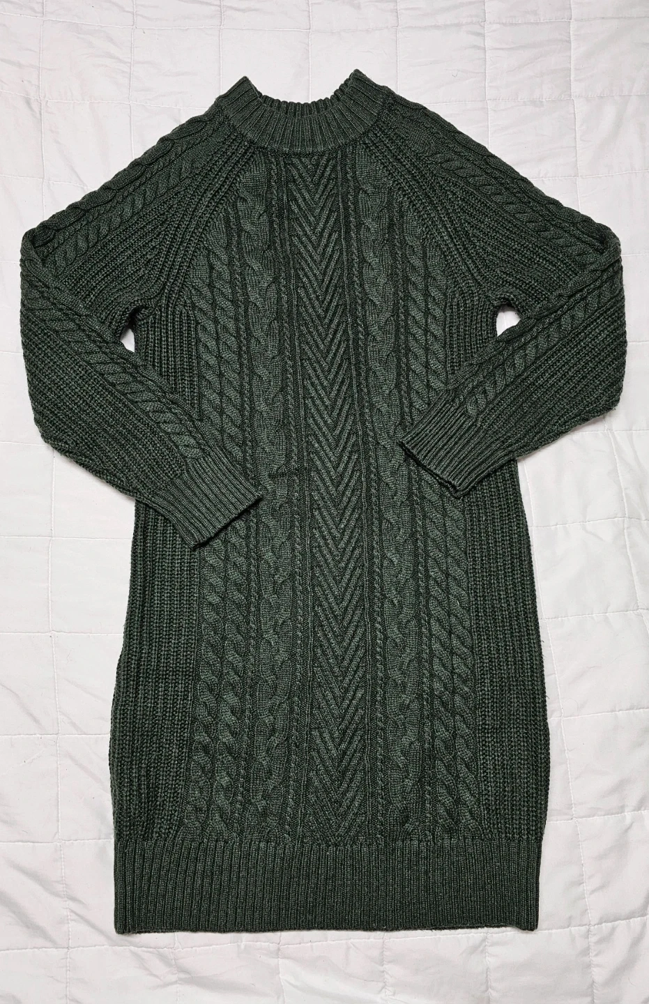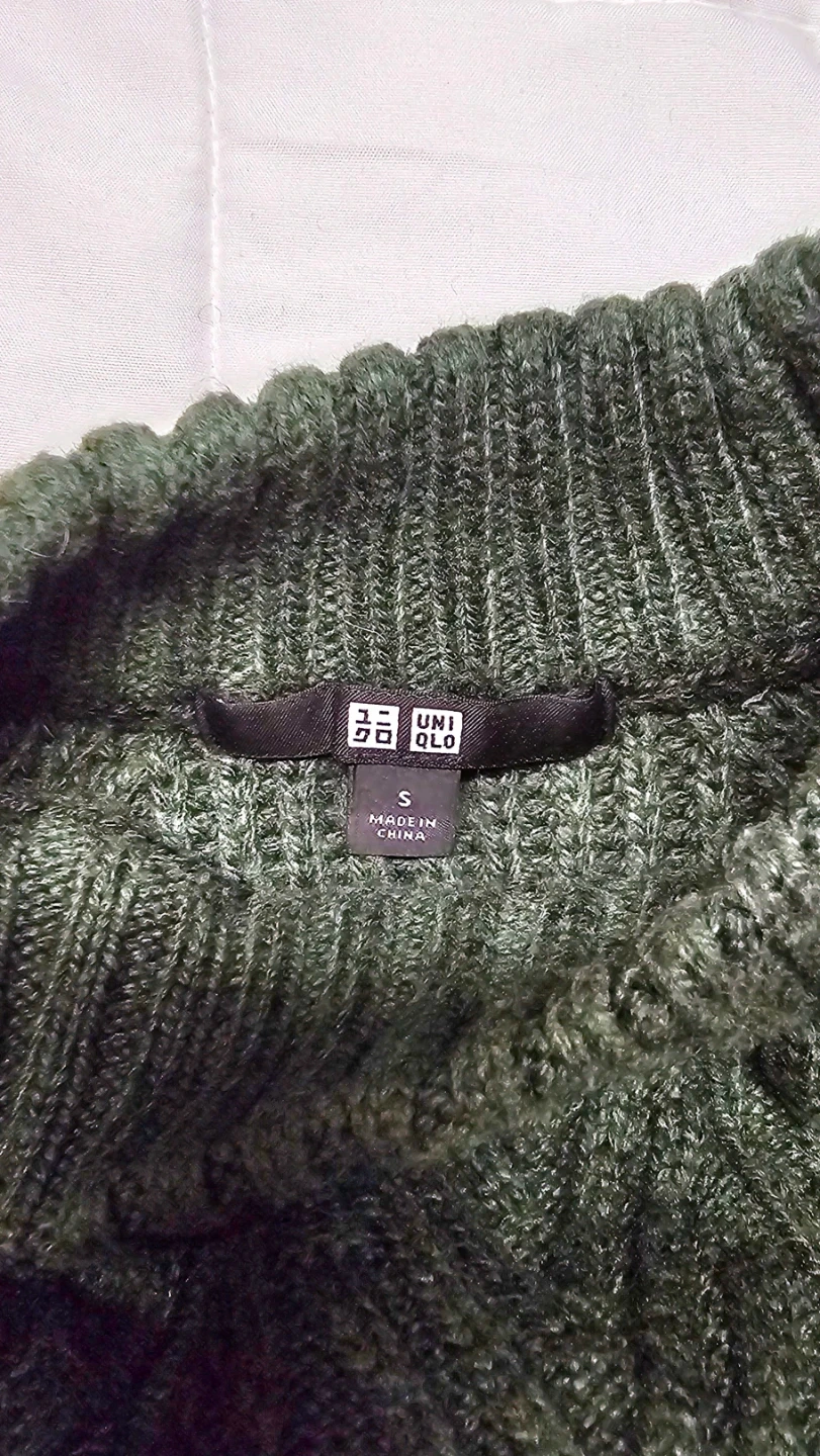 This UNIQLO sweater dress is a lovely forest green colour with a classic cable knit design. It's a size small. Made from a soft knit material, it's perfect for staying cozy on cooler days!