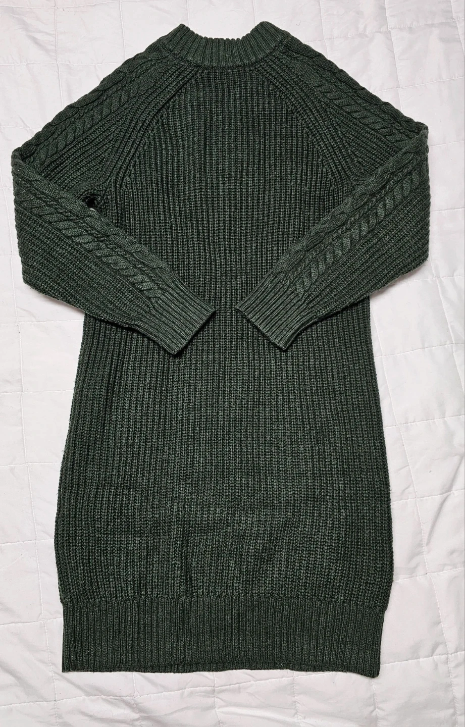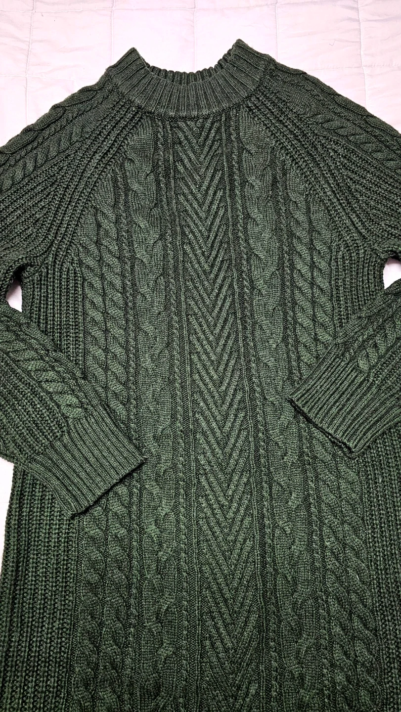 This UNIQLO sweater dress is a lovely forest green colour with a classic cable knit design. It's a size small. Made from a soft knit material, it's perfect for staying cozy on cooler days!