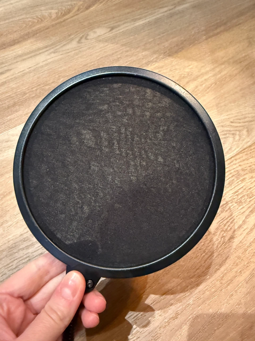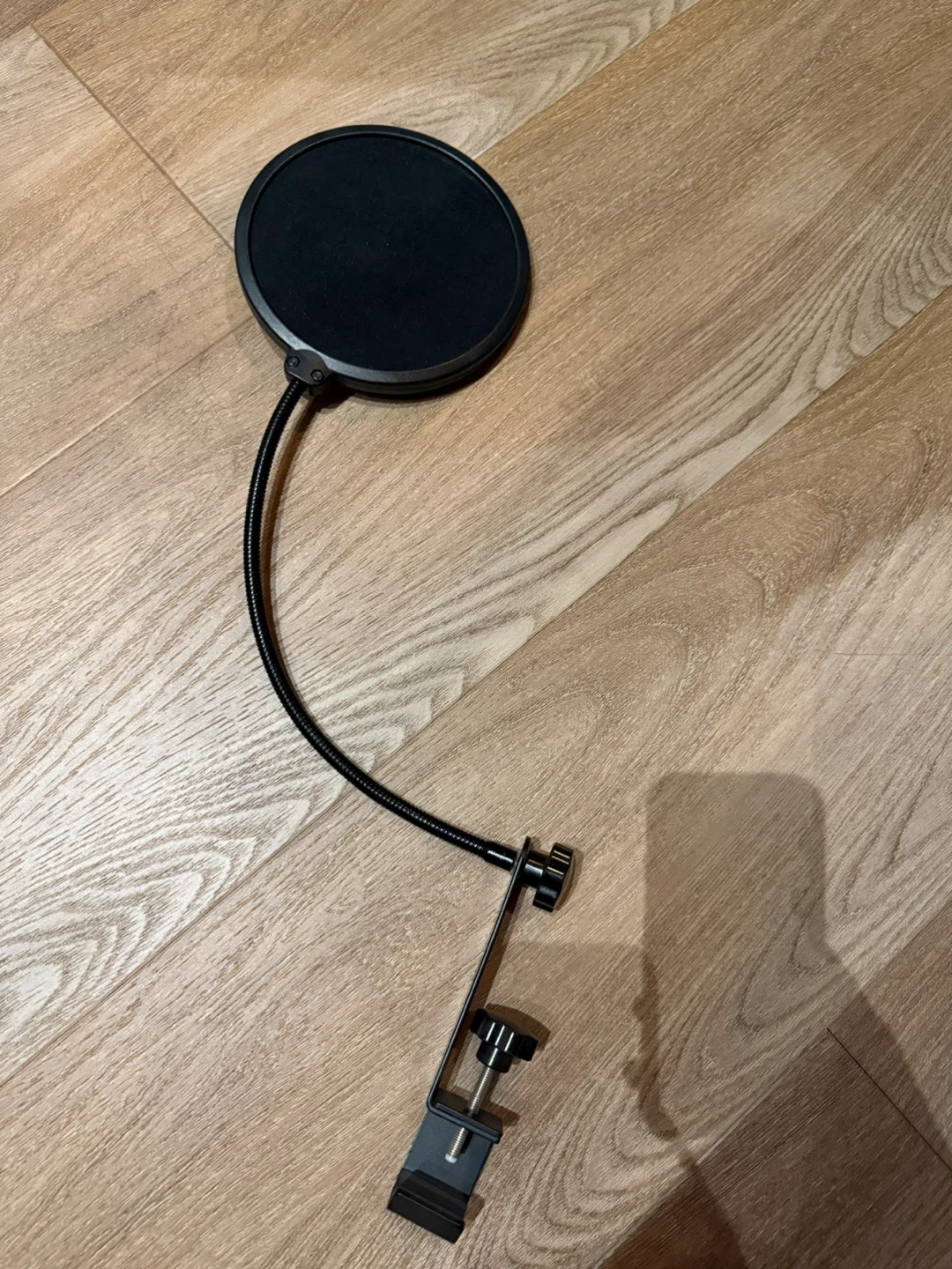This is a Sterling Audio PF2 professional mesh pop filter. It features a flexible gooseneck and a clamp mount. The mesh screen helps reduce plosives during recording. It's designed for vocalists and podcasters.