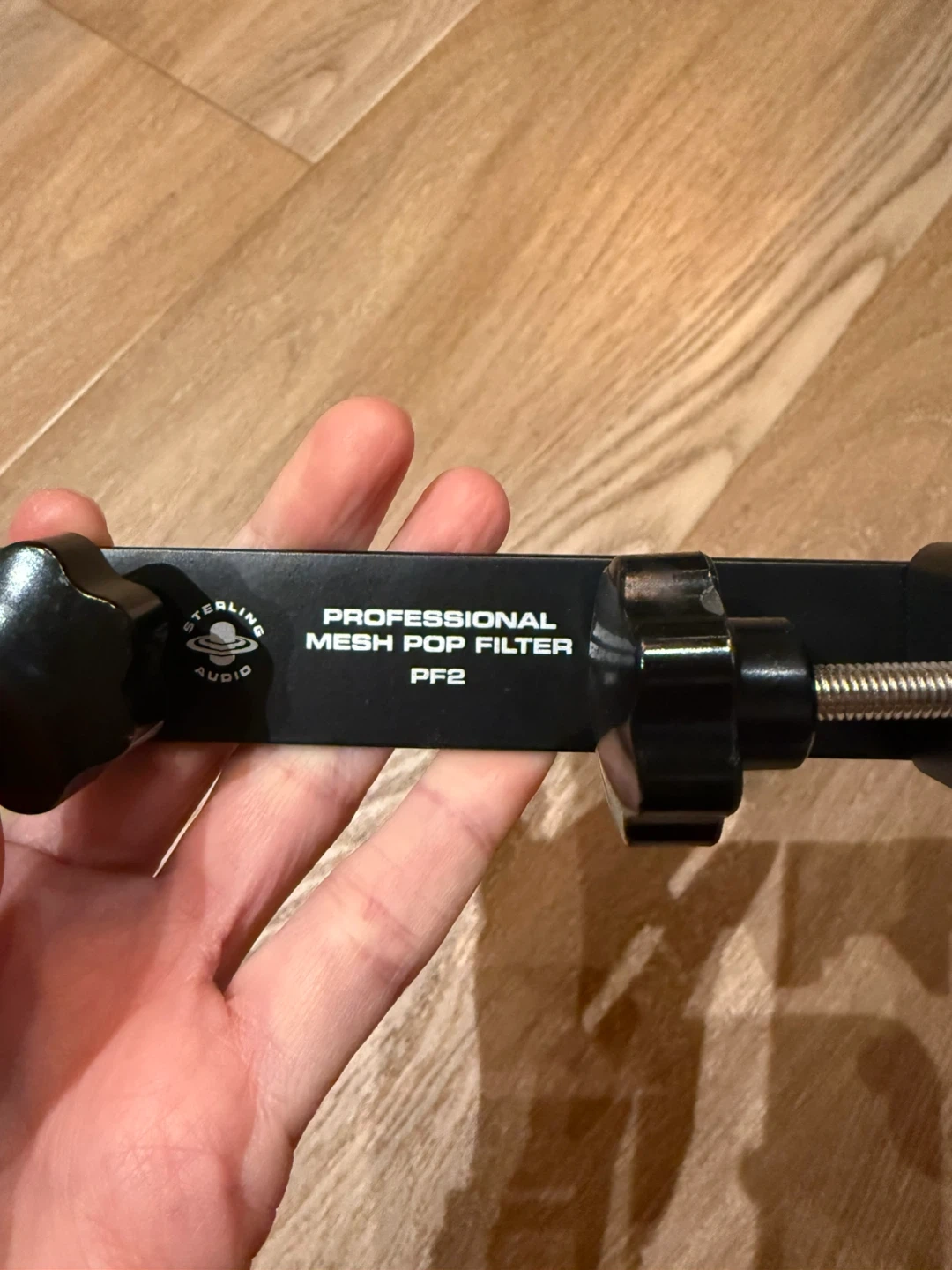 This is a Sterling Audio PF2 professional mesh pop filter. It features a flexible gooseneck and a clamp mount. The mesh screen helps reduce plosives during recording. It's designed for vocalists and podcasters.