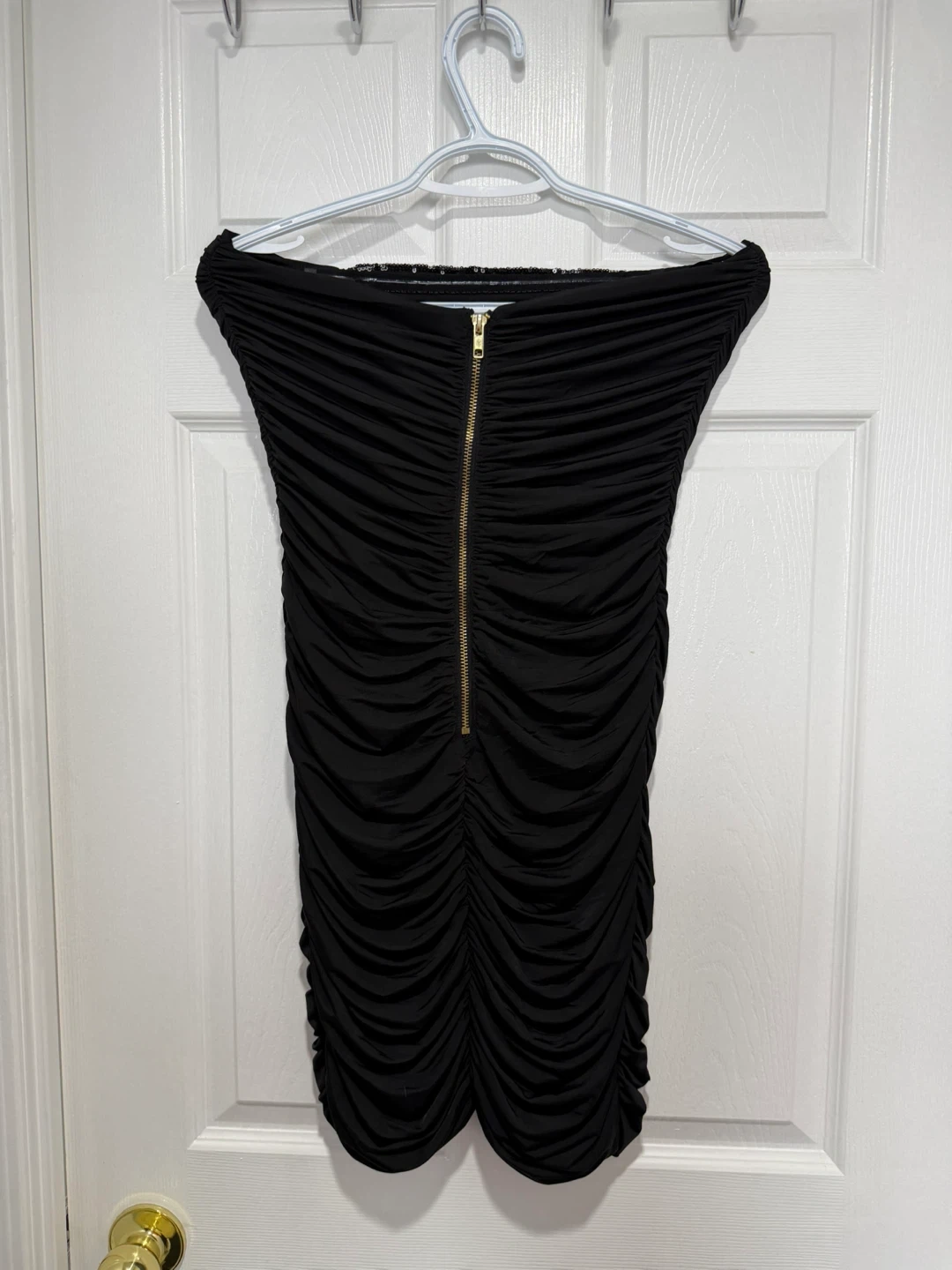 Bebe Addiction Black strapless dress features dazzling sequin detailing down the front and ruched sides. It's a size medium with a convenient back zipper. Perfect for a night out!