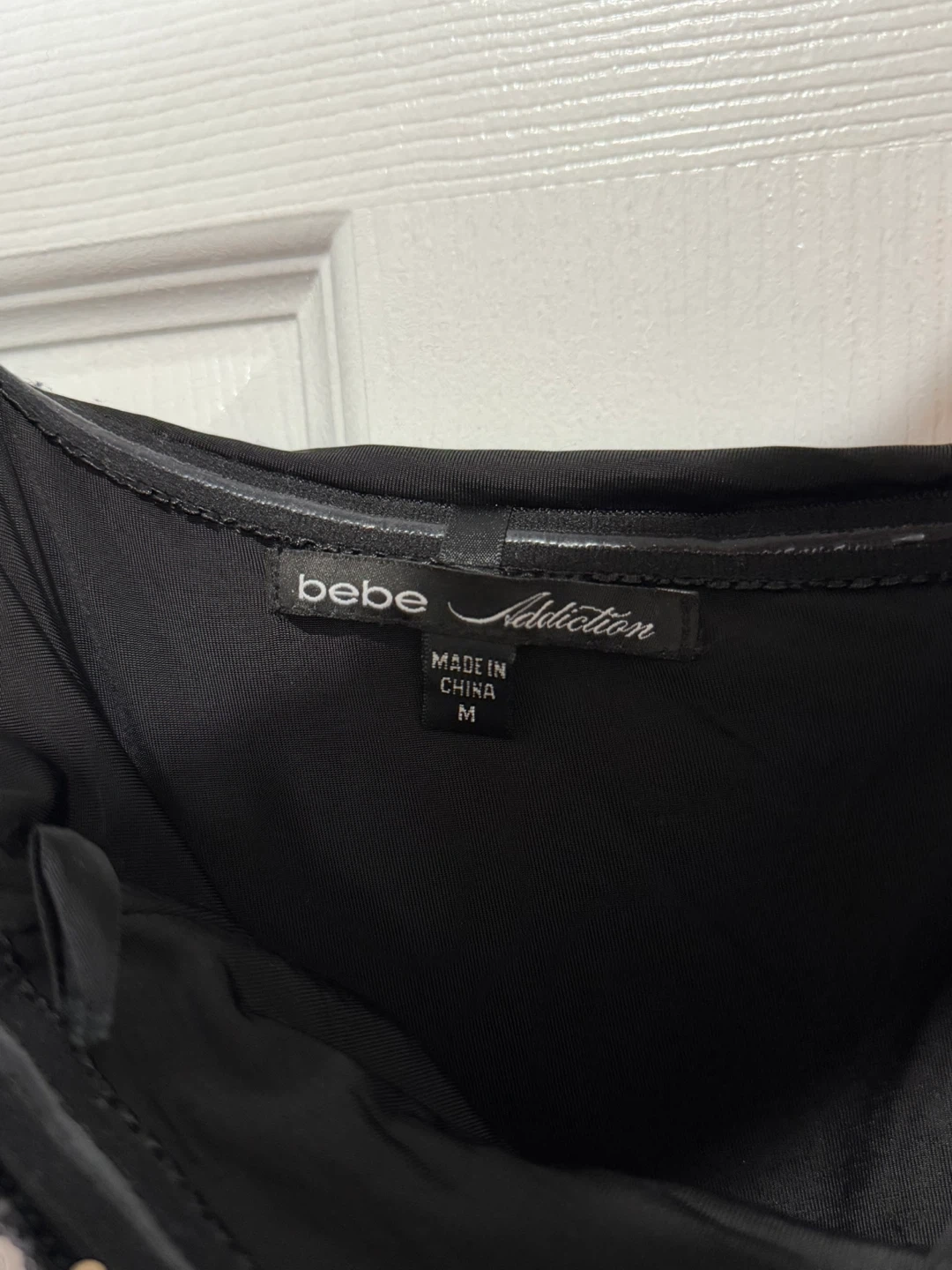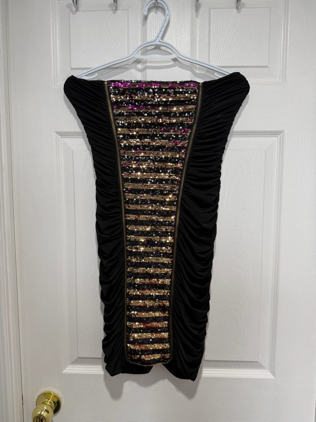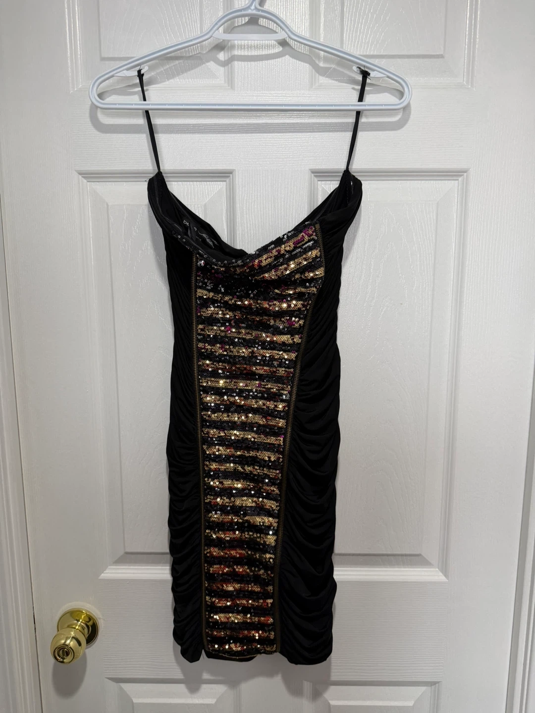 Bebe Addiction Black strapless dress features dazzling sequin detailing down the front and ruched sides. It's a size medium with a convenient back zipper. Perfect for a night out!