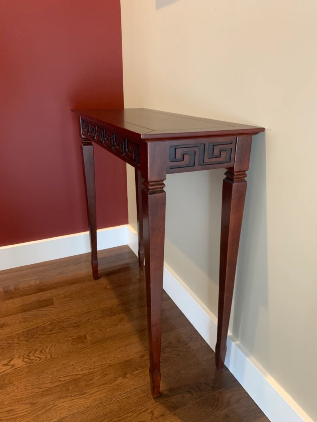 A stylish dark wood console table featuring a decorative Greek key inlay on the apron. Its slim design makes it a great accent piece for hallways or small spaces. Made of solid wood.