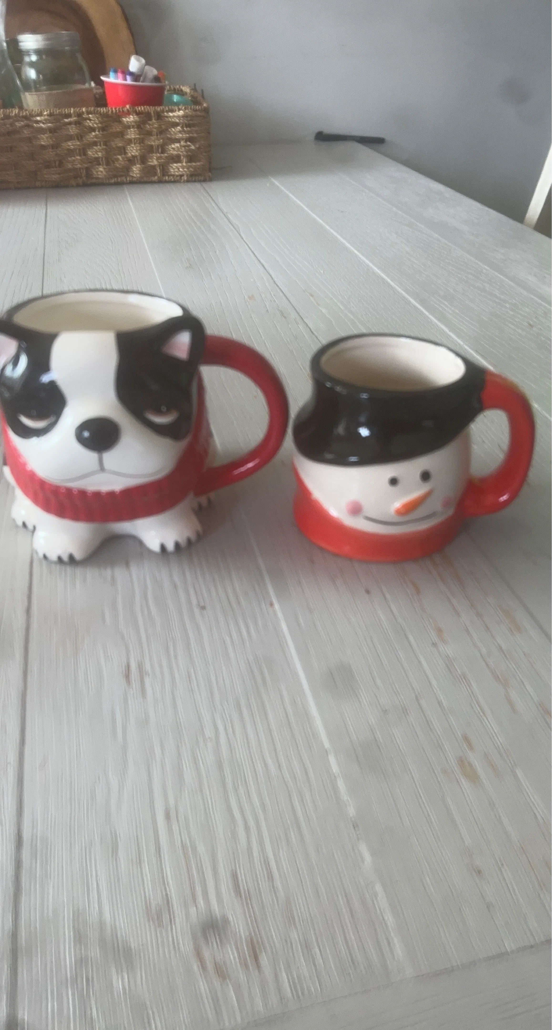 Two festive ceramic mugs, one shaped like a Boston Terrier and the other like a snowman. They're great for holiday drinks! I only take cash