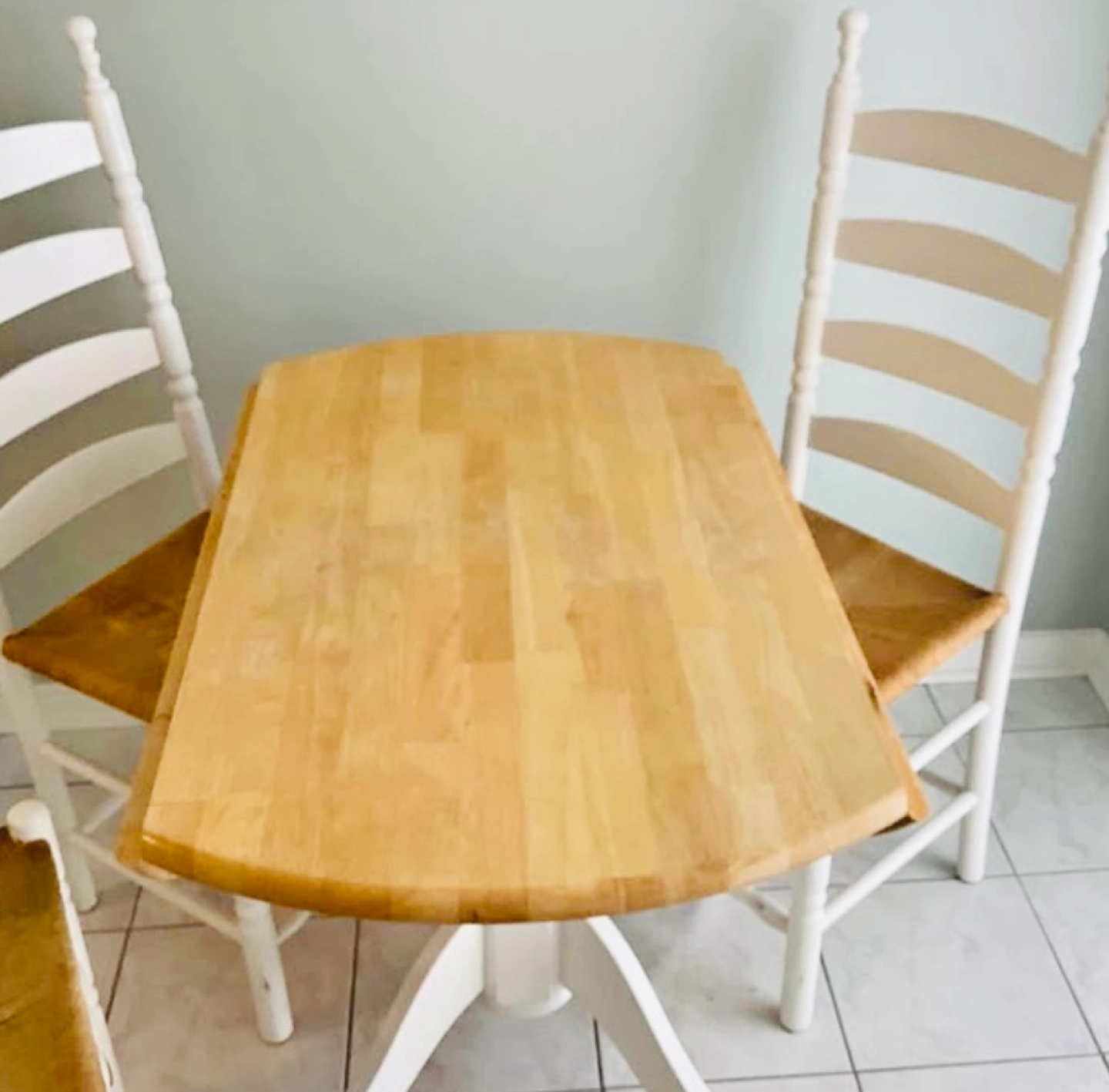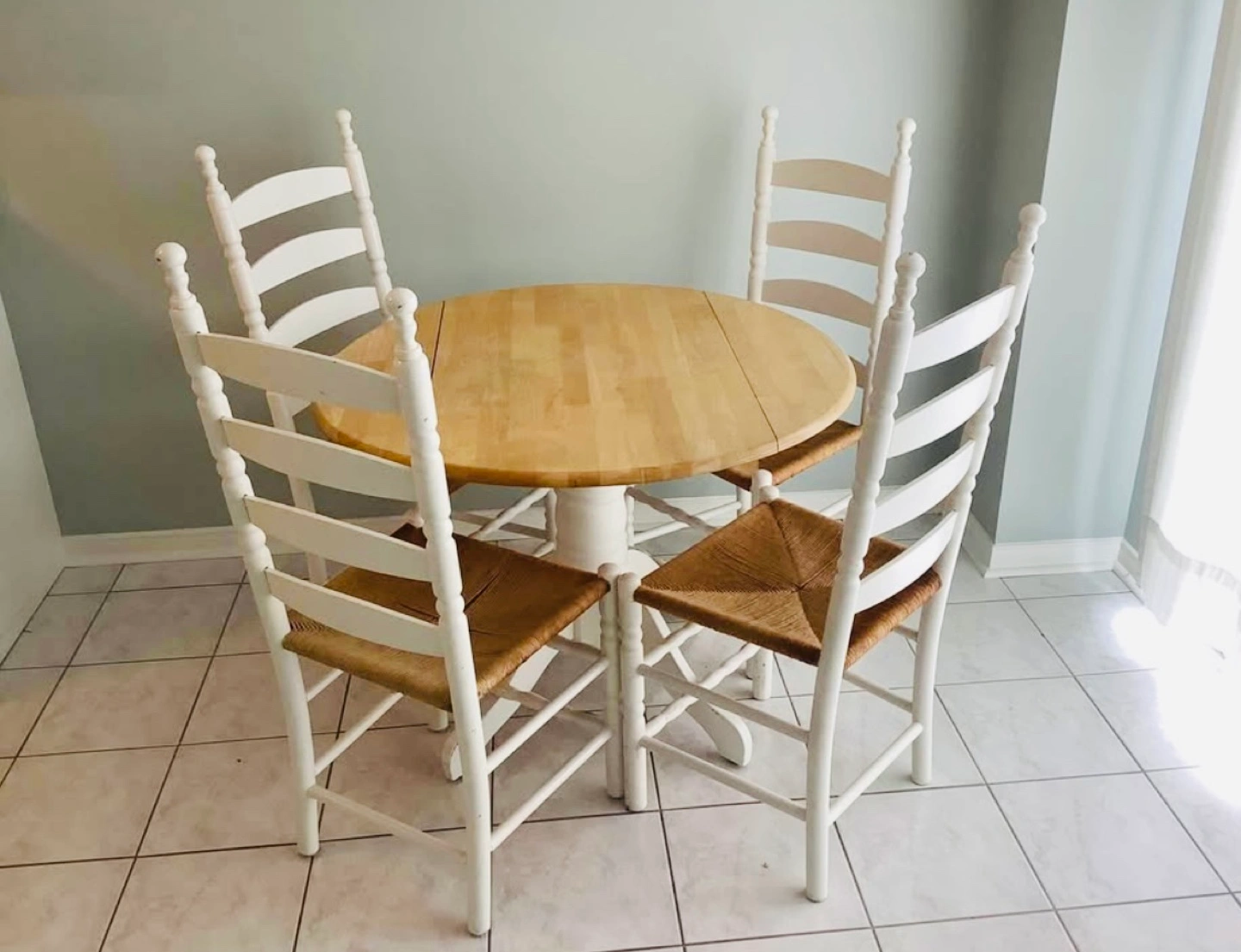 Beautiful round drop leaf table with four ladder back chairs. White painted finish on chairs. Natural wood table top. Chairs have woven seats.