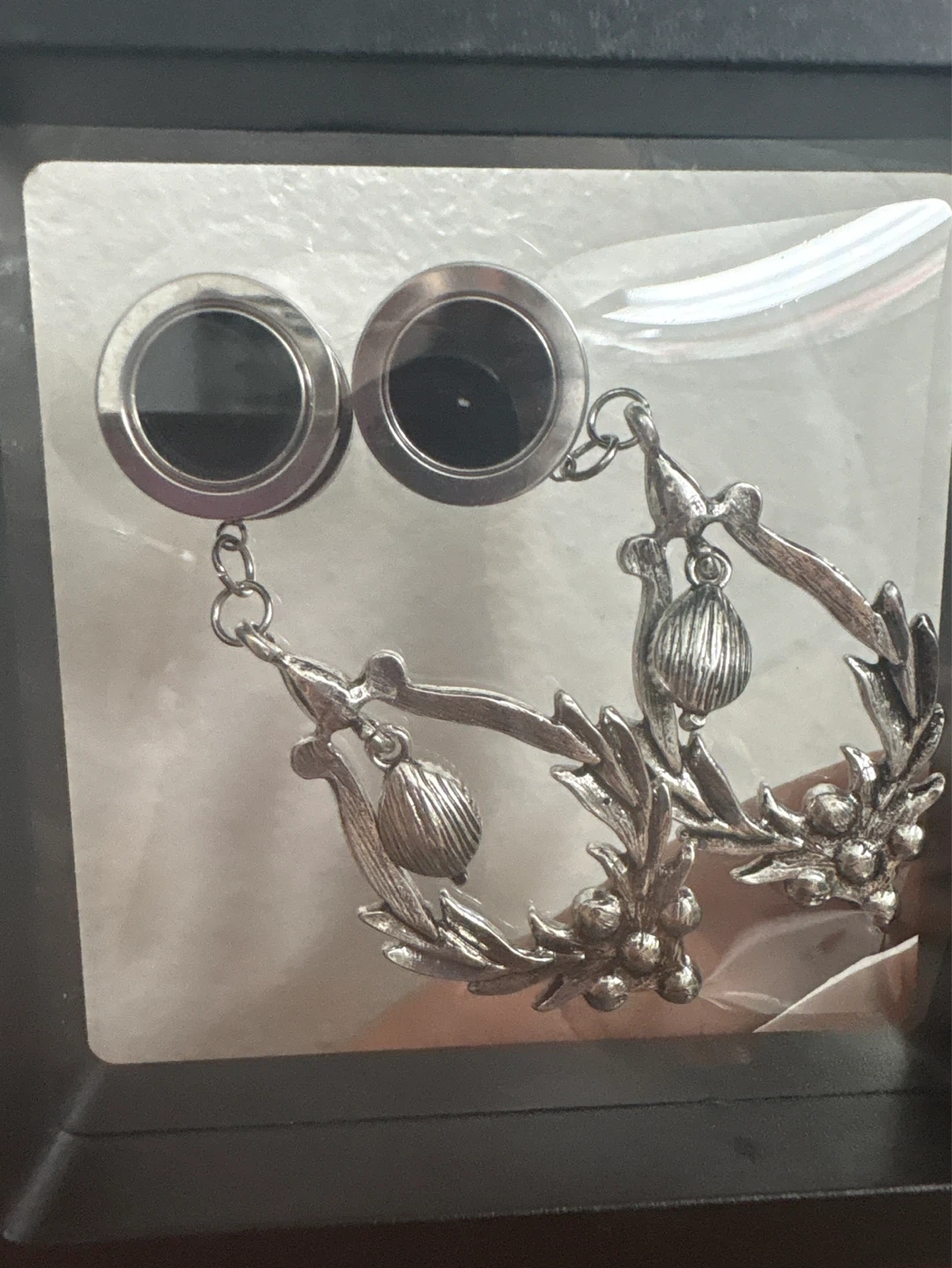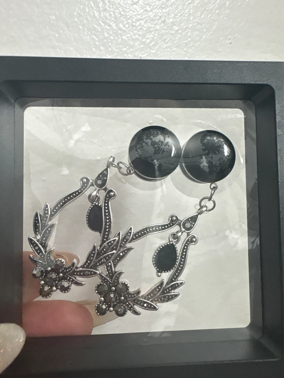 These unique PDG dangle earrings feature an ornate vintage design with black Onyx stones. They're crafted with a silver-tone metal and measure approximately 2.5 inches long. These would add a touch of elegance to any outfit! New with Box