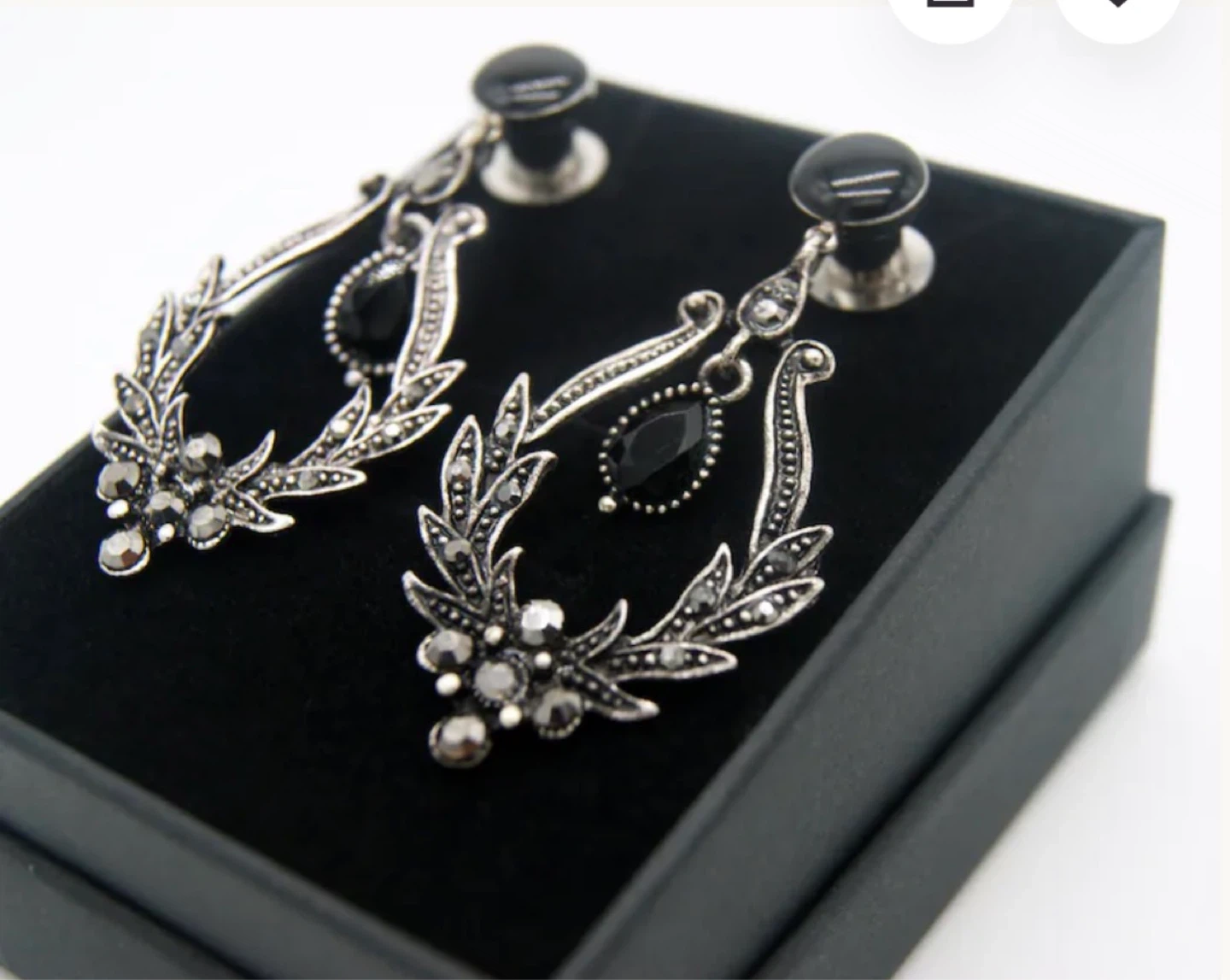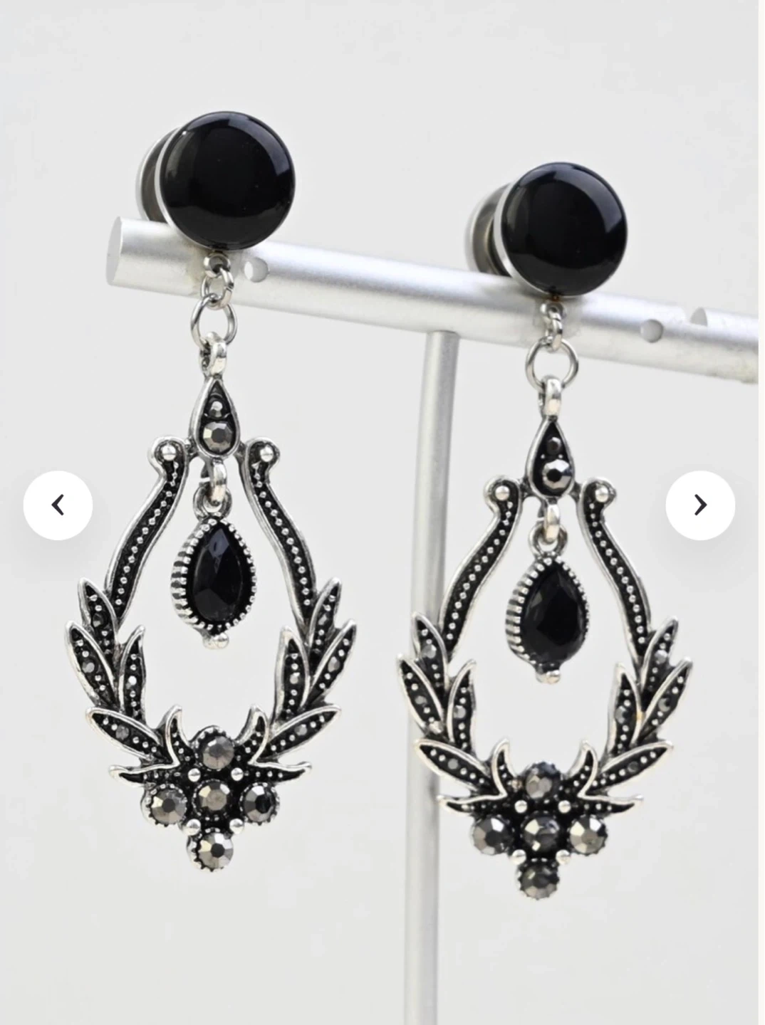 These unique PDG dangle earrings feature an ornate vintage design with black Onyx stones. They're crafted with a silver-tone metal and measure approximately 2.5 inches long. These would add a touch of elegance to any outfit! New with Box