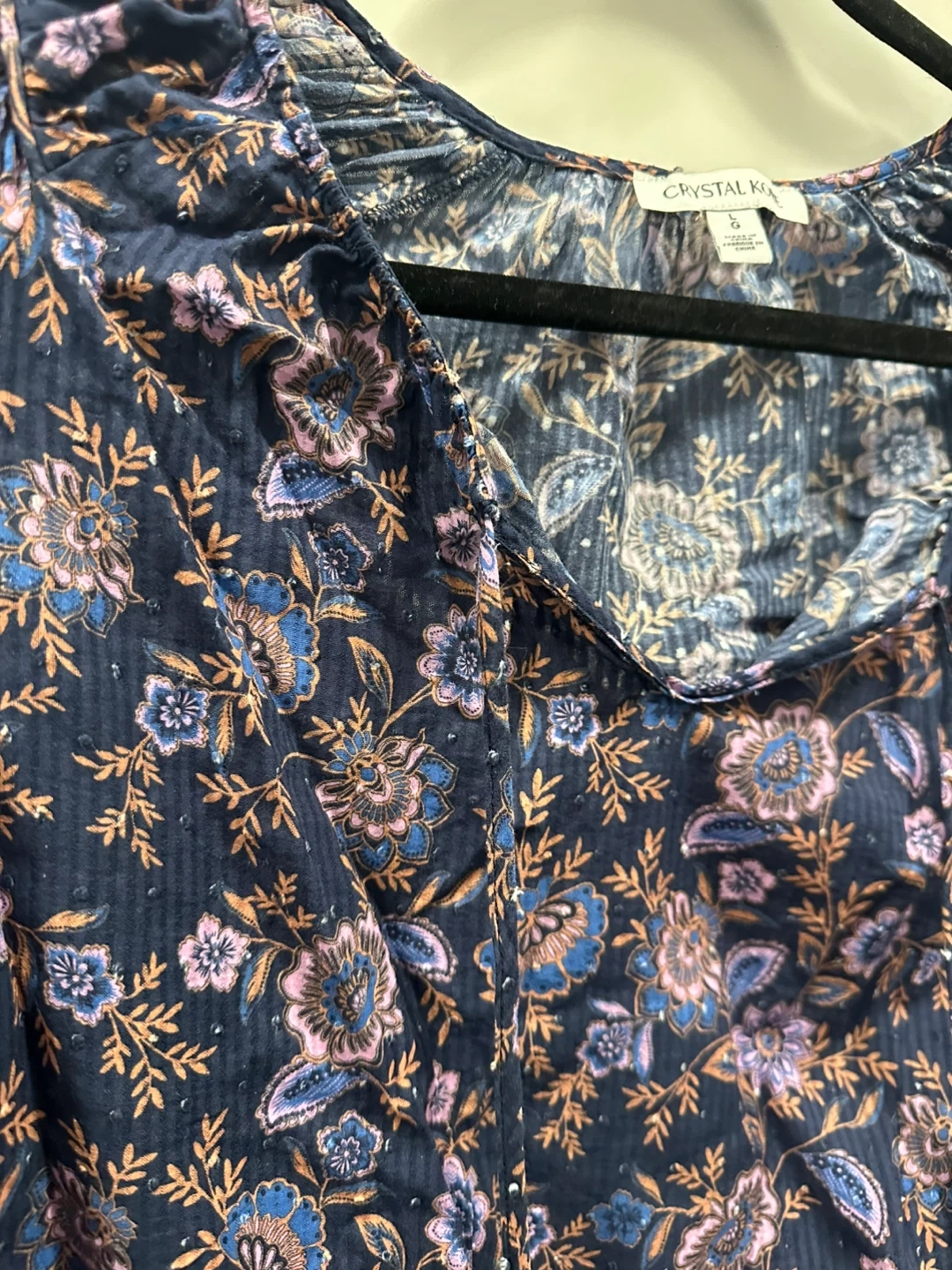 *Brand New* ladies long sleeve peasant-style shirt in navy floral design. Ribbed cuffs.