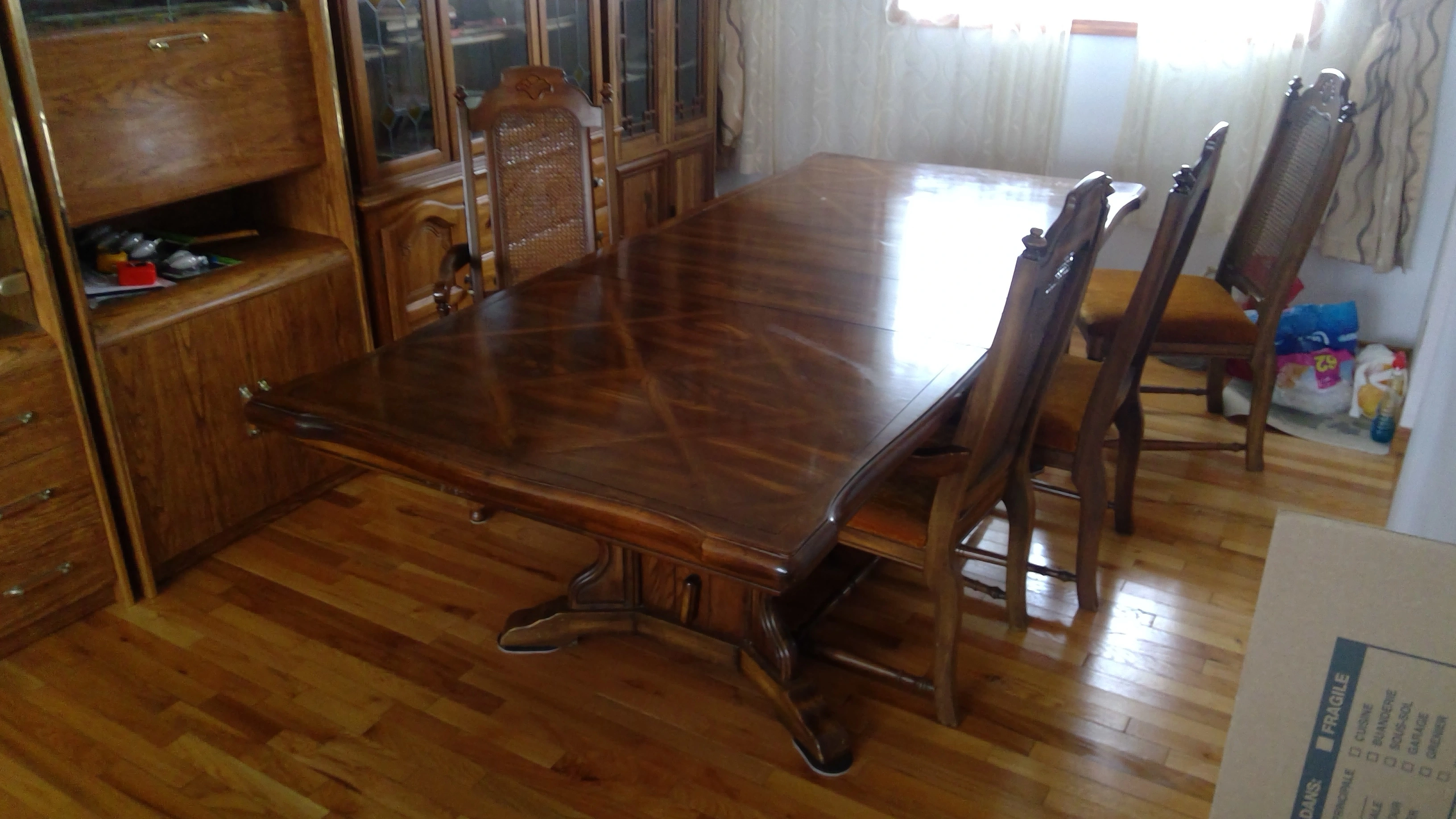 - Includes table, 5 chairs, and leaves/extensions