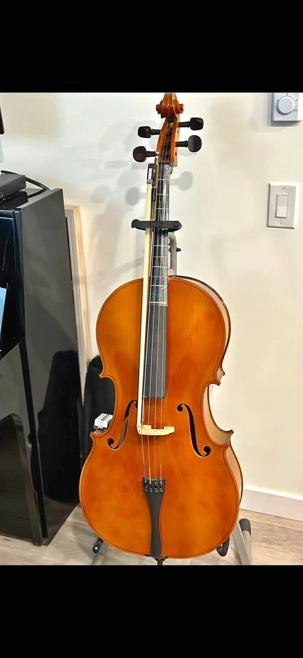 Beautiful 4/4 cello with a classic reddish-brown wood finish. Comes with a bow, a stand, and both light and dark rosin. Ready for someone to play some tunes.