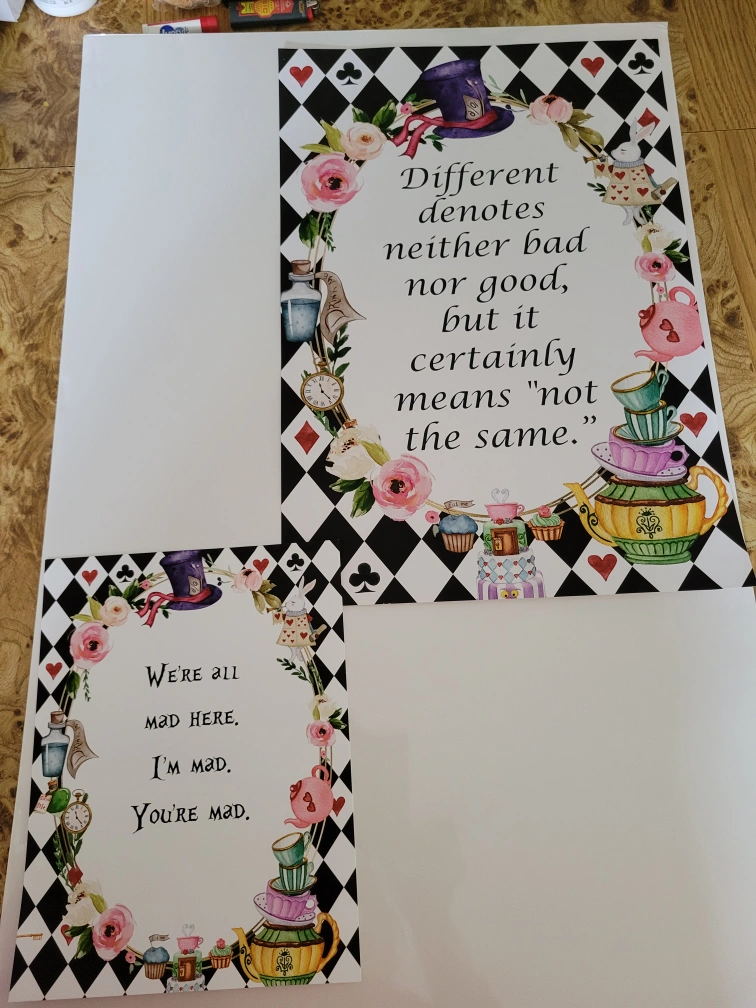Selling an Alice in Wonderland-themed homemade poster. It's got the tea cups & pot, the rabbits watch, the Mad Hatter's hat, and other iconic imagery from the story. Great for any Disney or Alice in Wonderland fan.