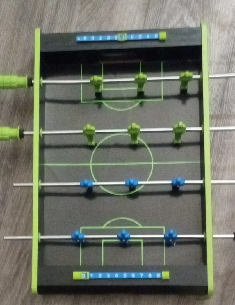 This is a mini foosball table with green and blue players. It has a scoreboard at each end for keeping track of the game. It's a fun tabletop game for kids or adults!