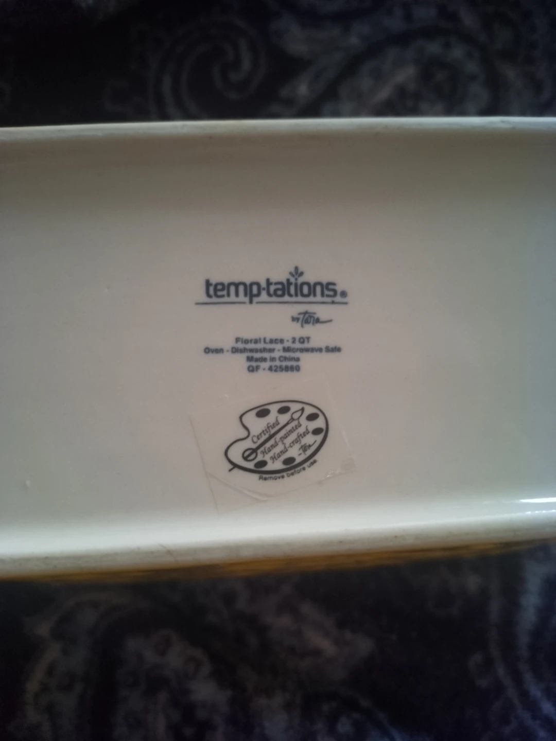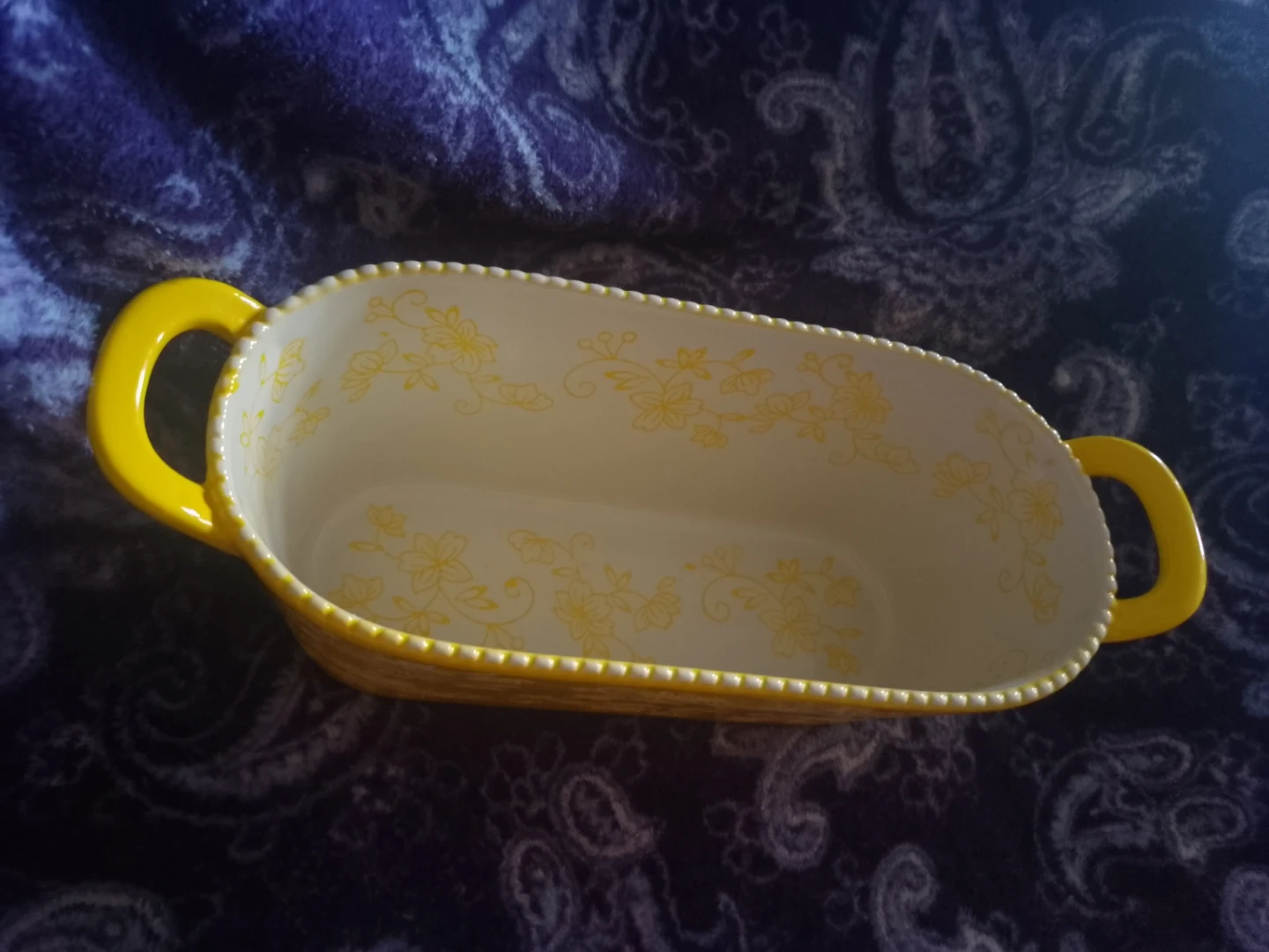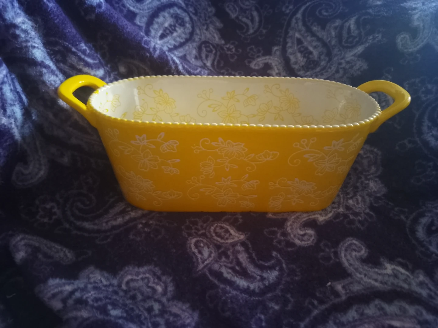 This is a Temptations by Tara floral lace baking dish. It's a 2 QT size, oven, dishwasher, and microwave safe. The dish features yellow handles and a yellow floral pattern on the outside.