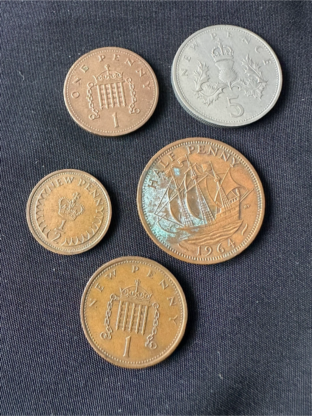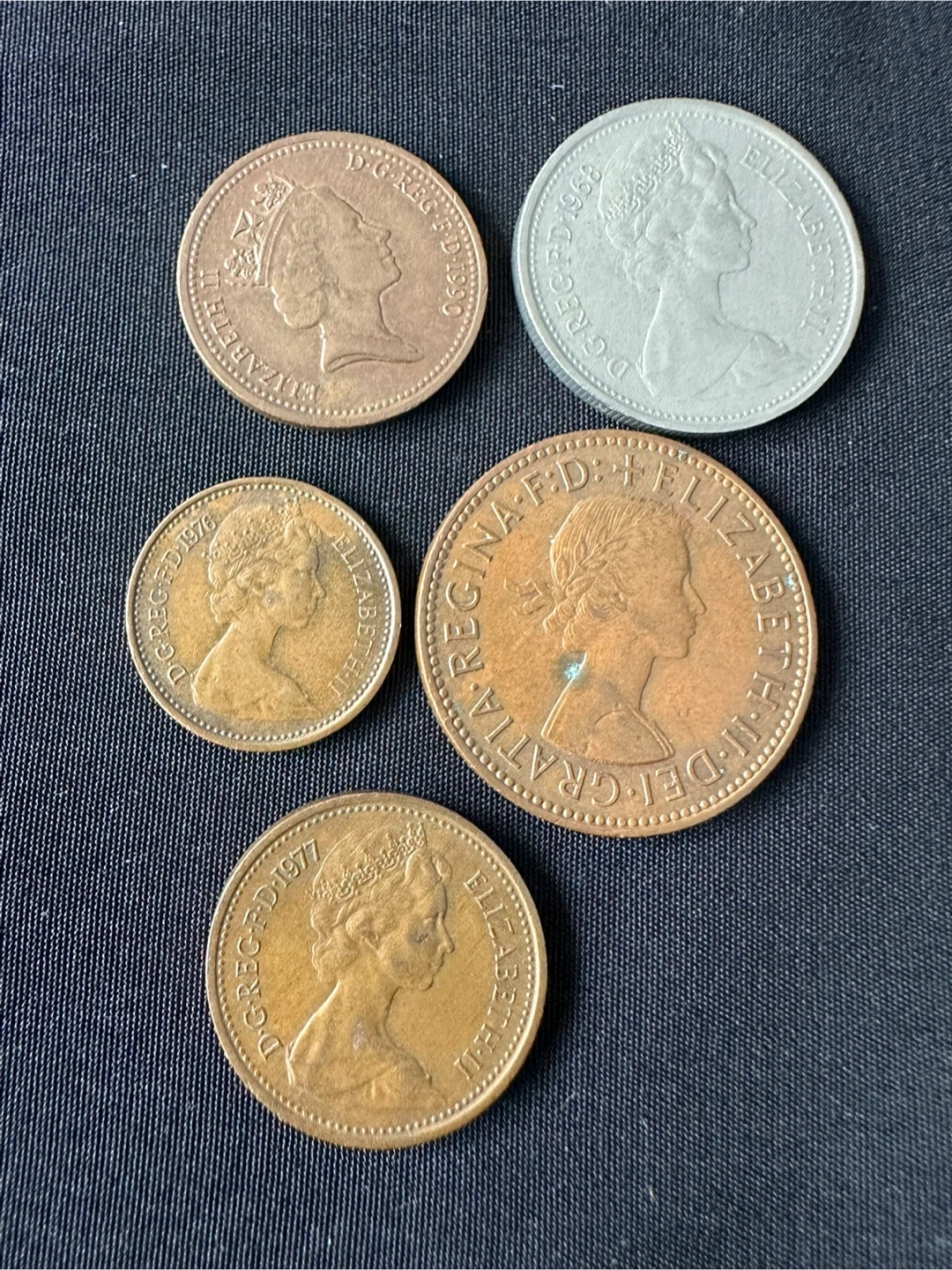 This collection features several United Kingdom pre-decimal coins. It includes a 1964 half penny, two 1970s one penny coins, a 1958 sixpence, and one other copper penny. These coins showcase Queen Elizabeth II's effigy.