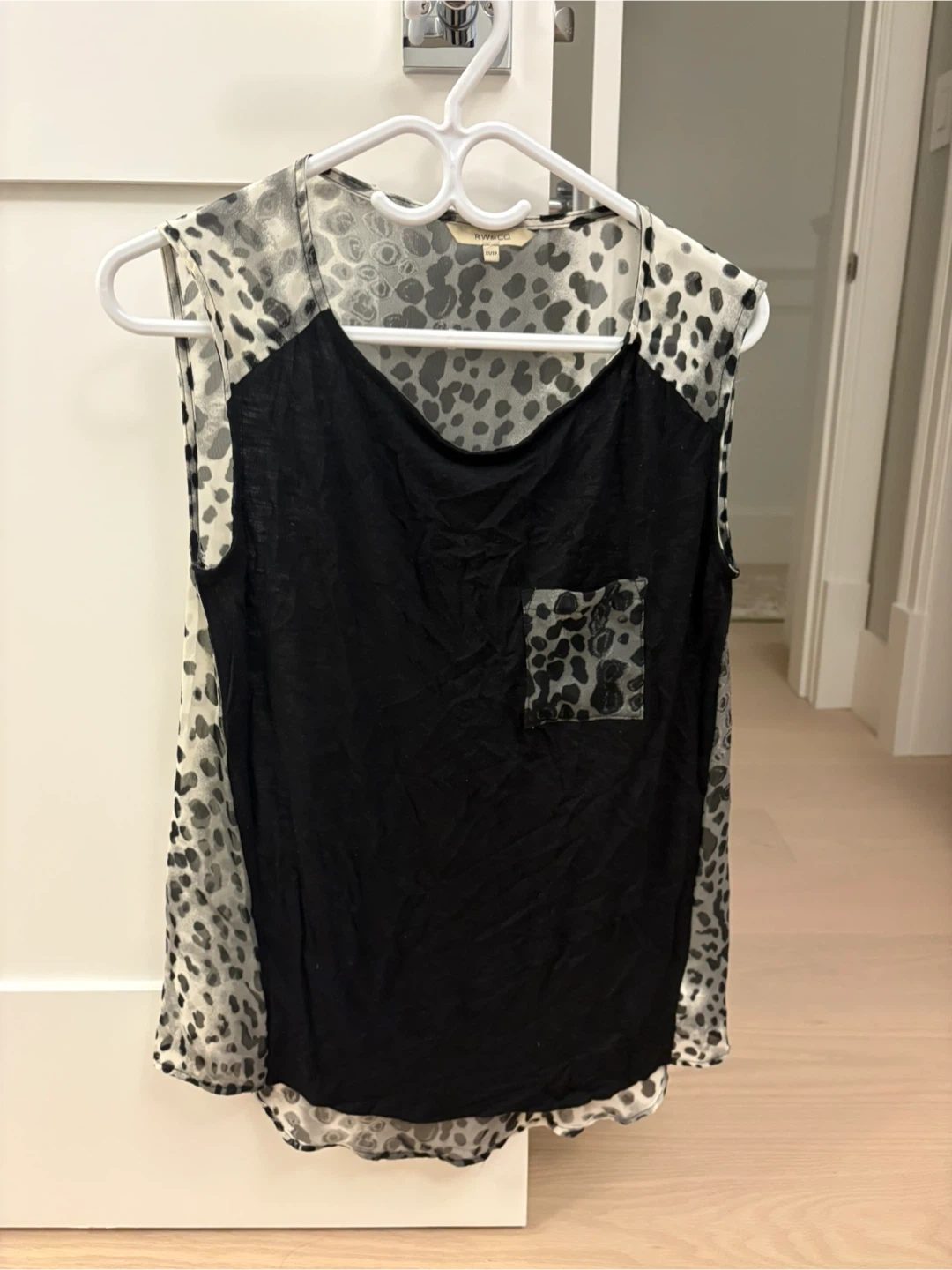 Here's a cute blouse with a leopard print design! It's a size x small and in great condition. Perfect for adding a bit of flair to your wardrobe