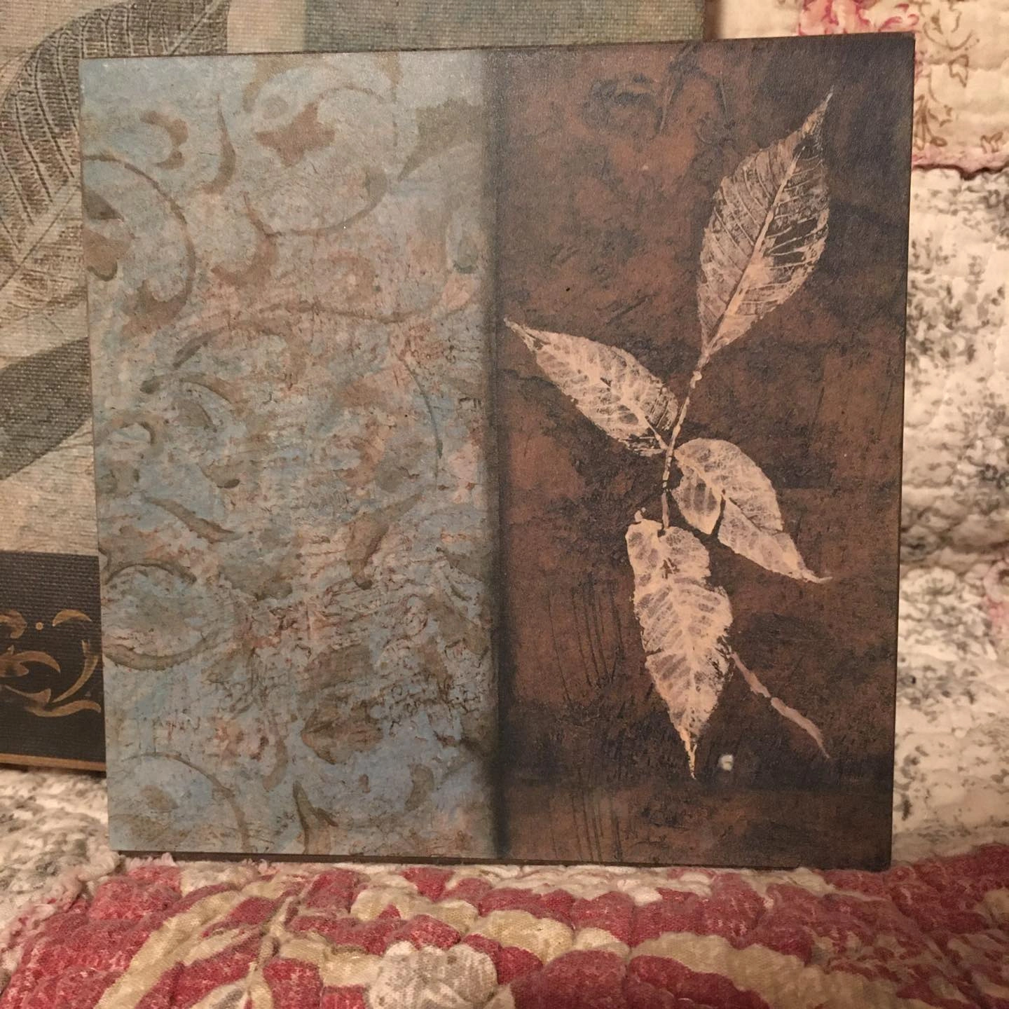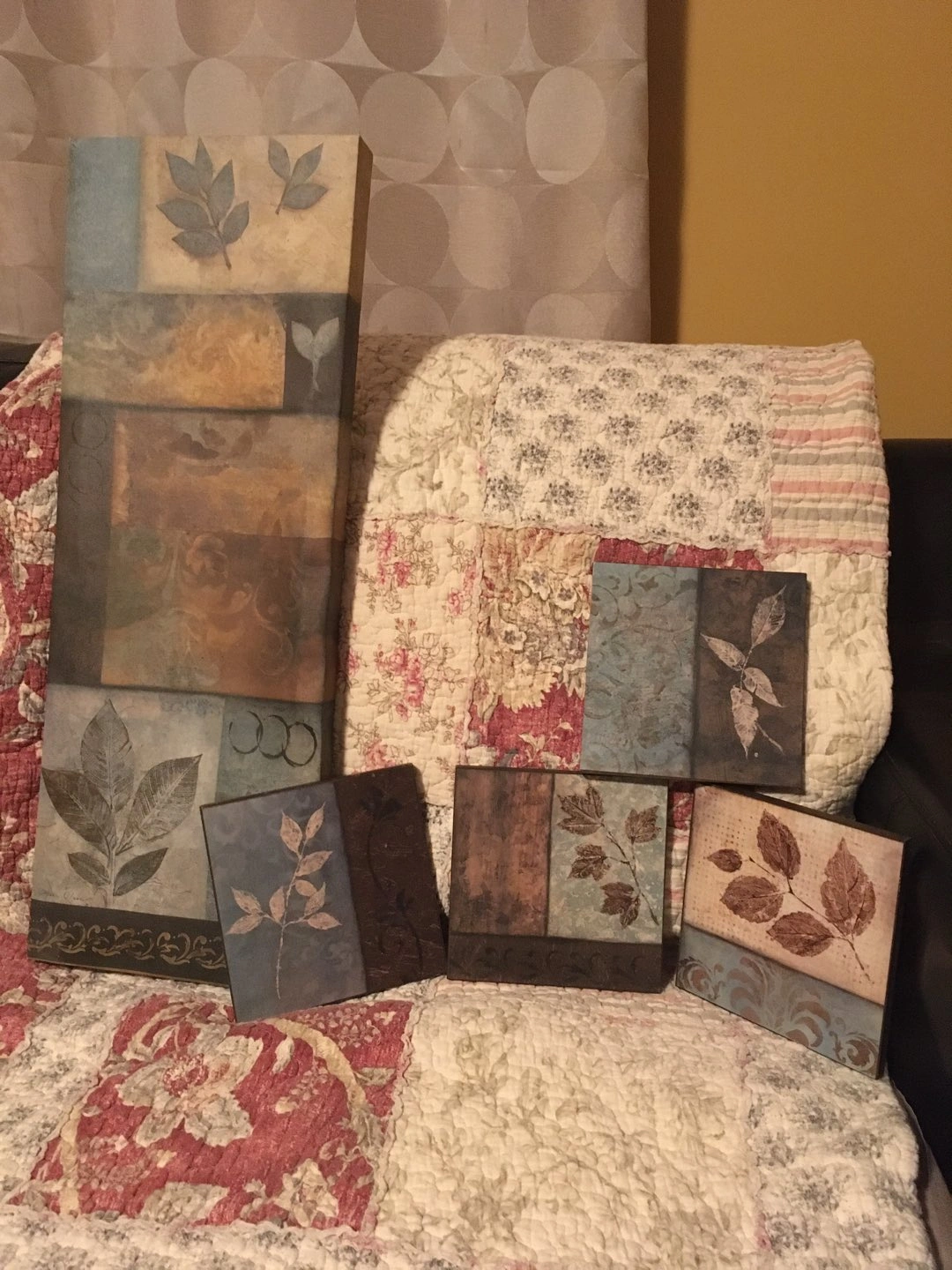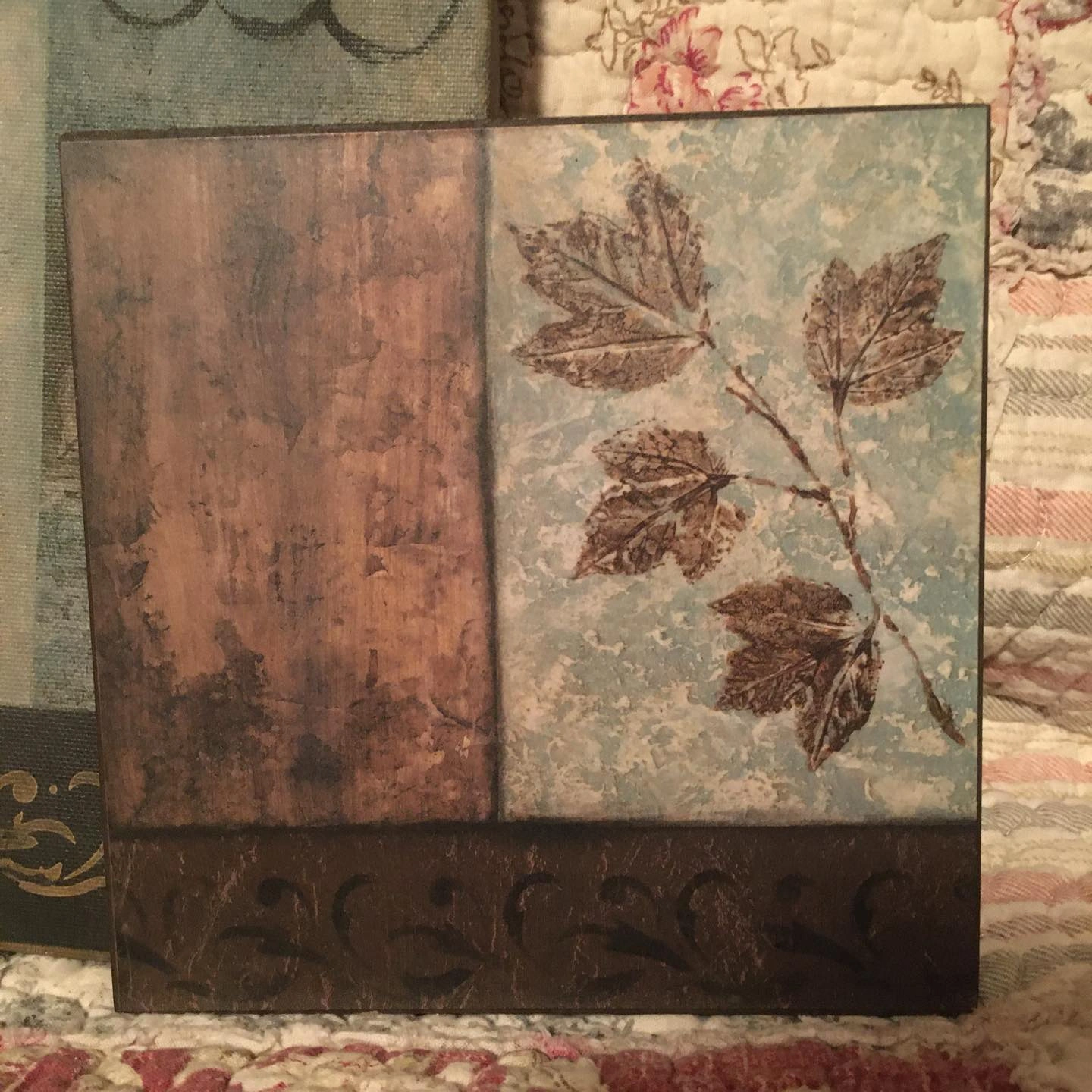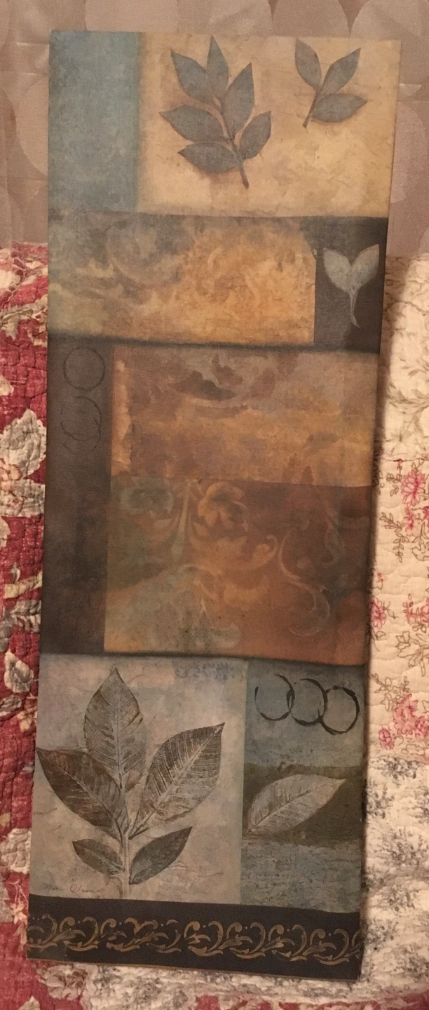 One large ‘canvas’ art piece (23.5 x 8.5 inches) and four plaque mounted smaller pieces (5.75 x 5.75 inches). A nice set for decorating the cottage or a covered patio. Large piece and one of the smaller pieces have a bit of damage (see photos of the backs of each of the two pieces).