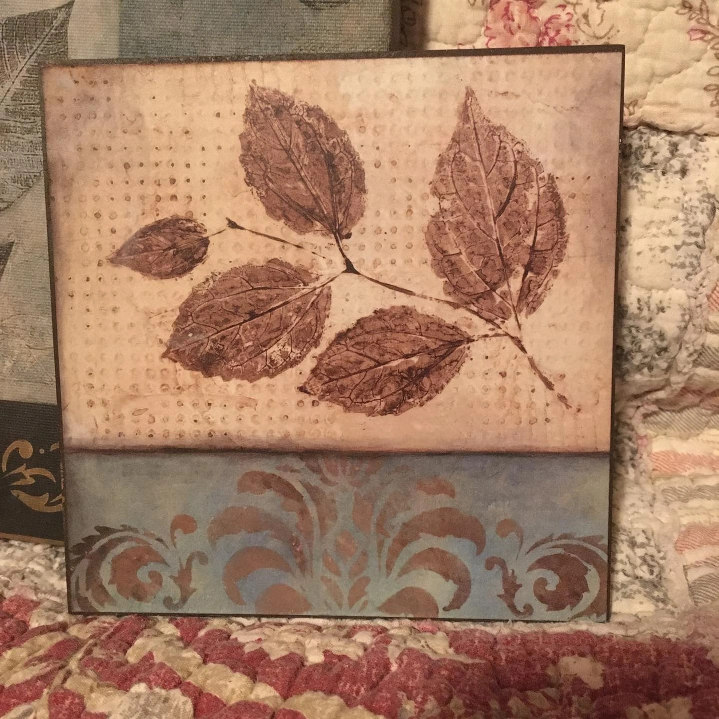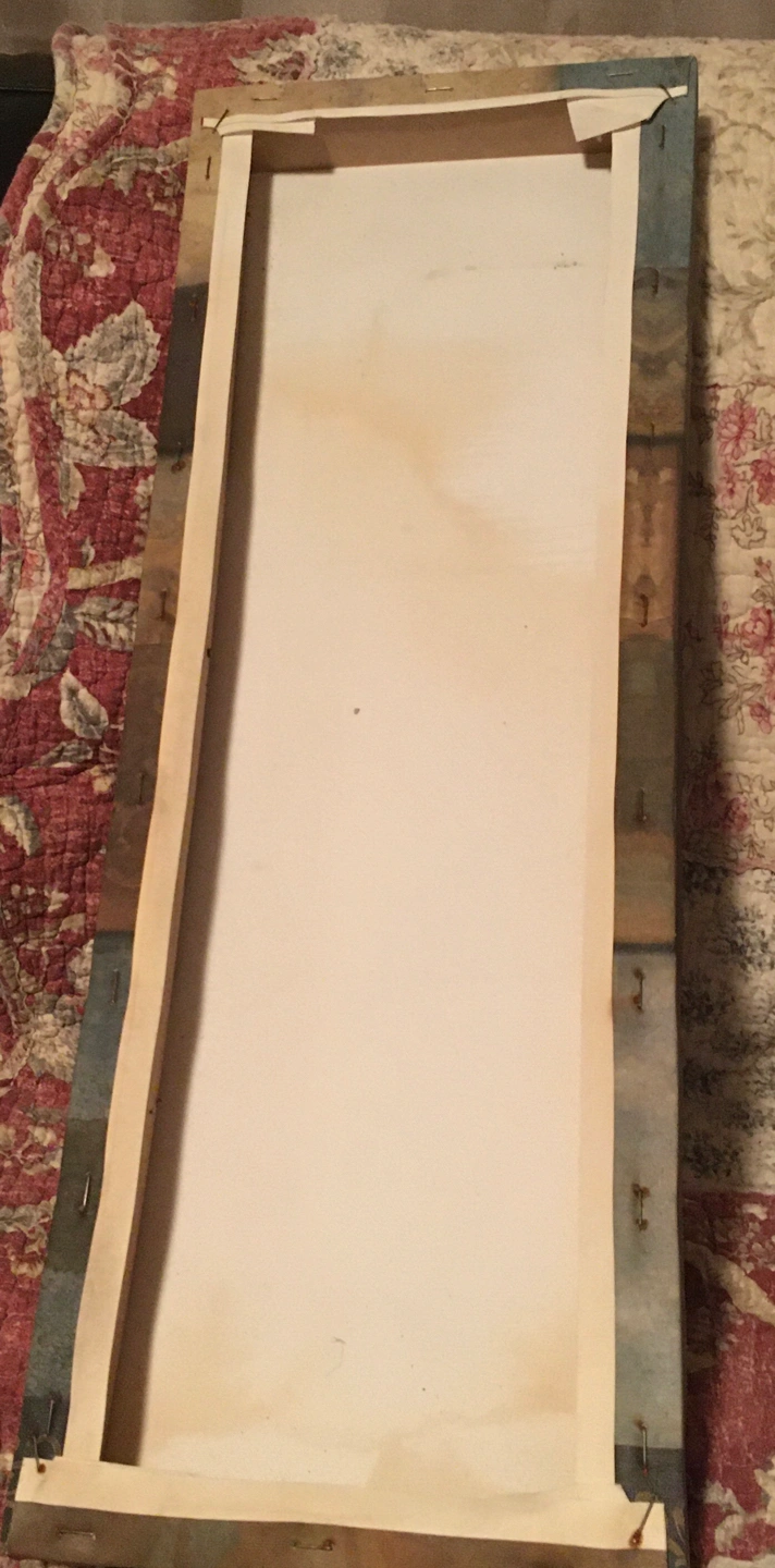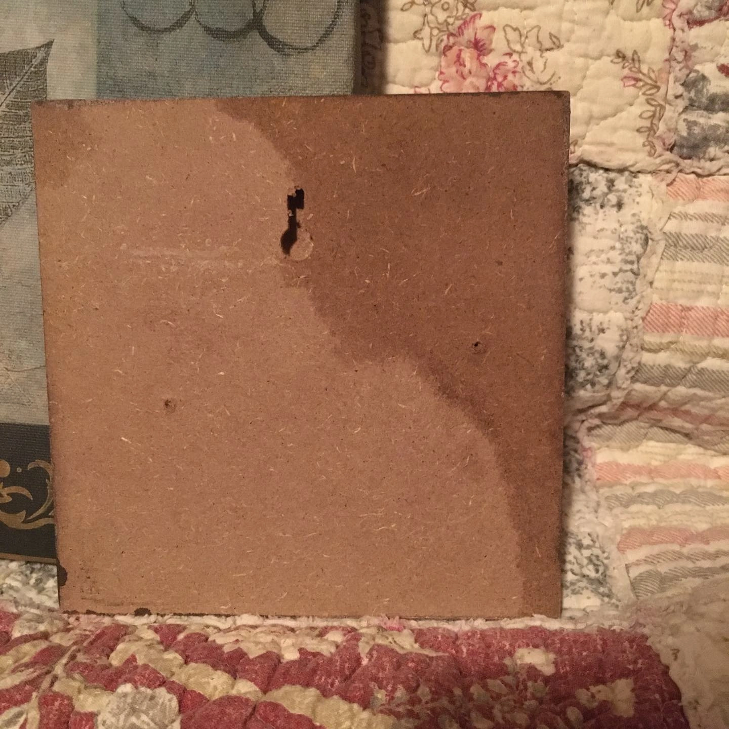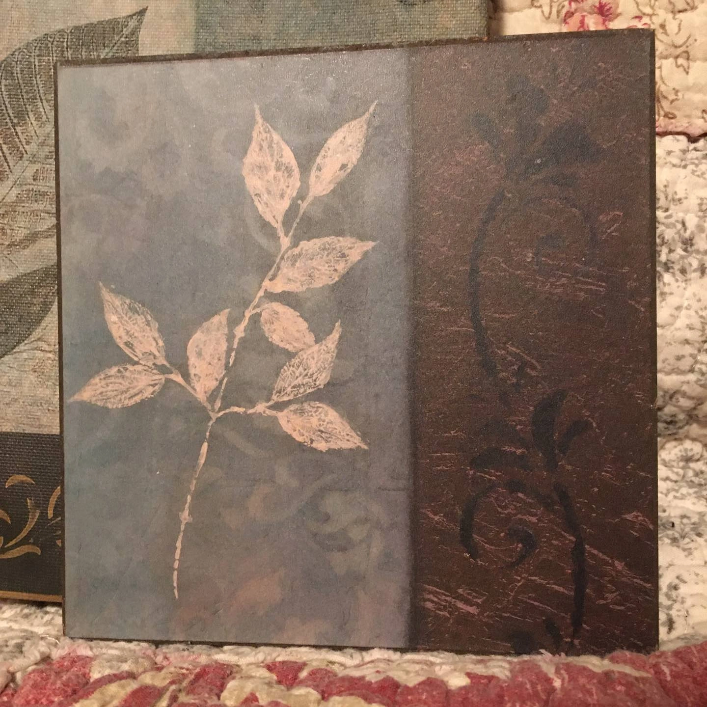 One large ‘canvas’ art piece (23.5 x 8.5 inches) and four plaque mounted smaller pieces (5.75 x 5.75 inches). A nice set for decorating the cottage or a covered patio. Large piece and one of the smaller pieces have a bit of damage (see photos of the backs of each of the two pieces).