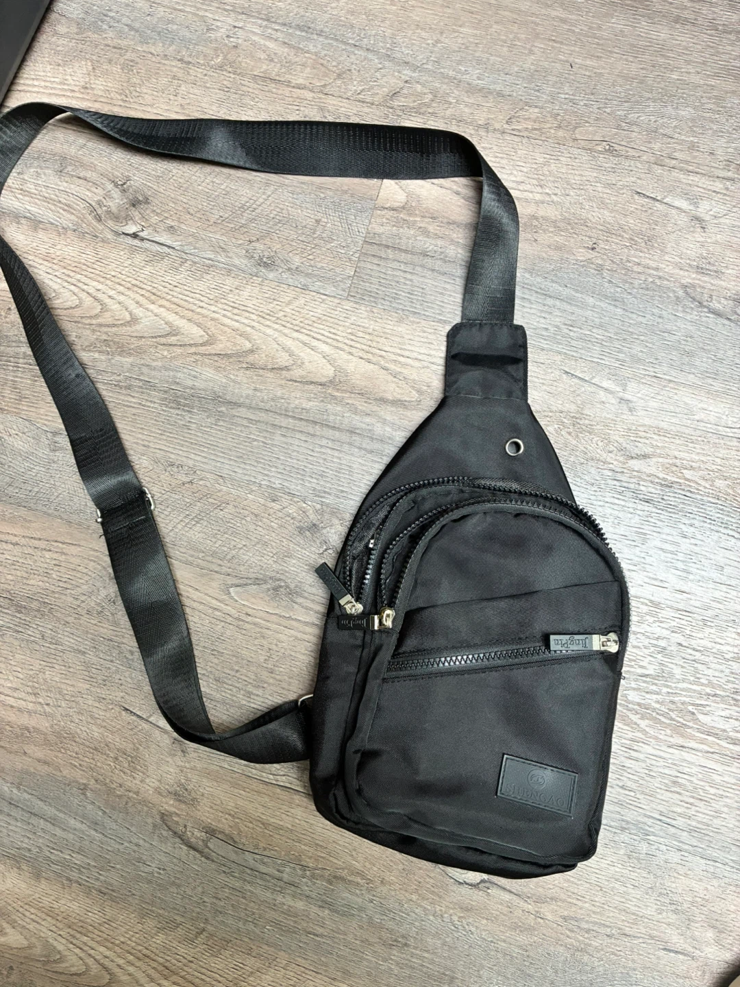 This is a black sling bag with multiple zippered compartments. It's made of durable nylon material. This bag is great for everyday use and travel!