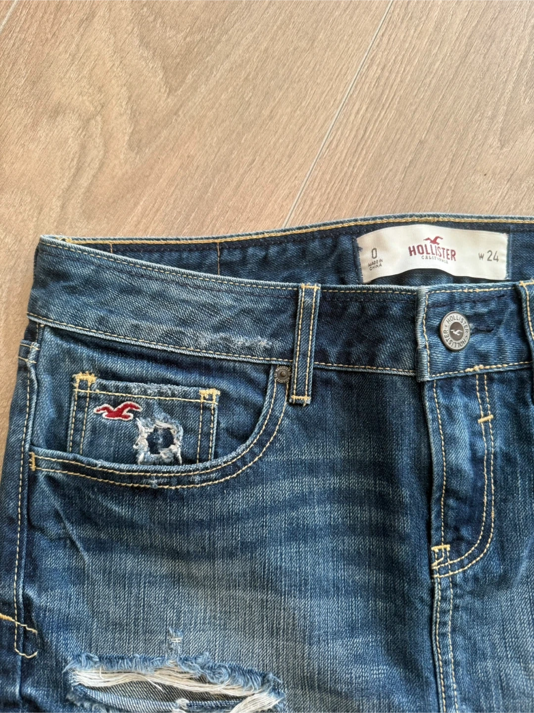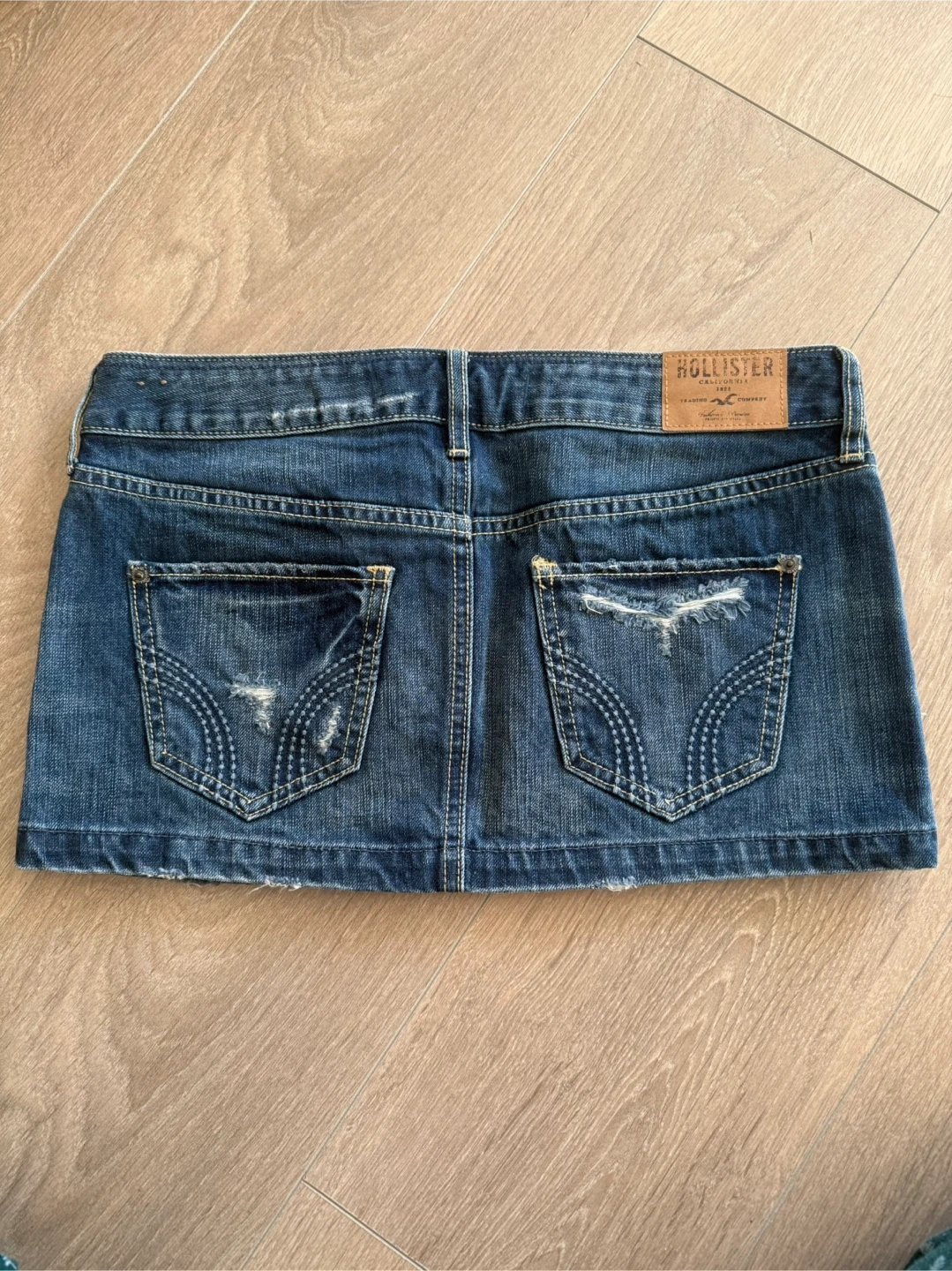 Vintage Hollister denim mini skirt. Size is W24. Dark wash with distressed detailing. Denim material. Only worn once or twice selling since its big on me.
