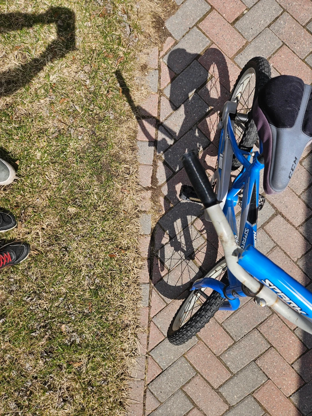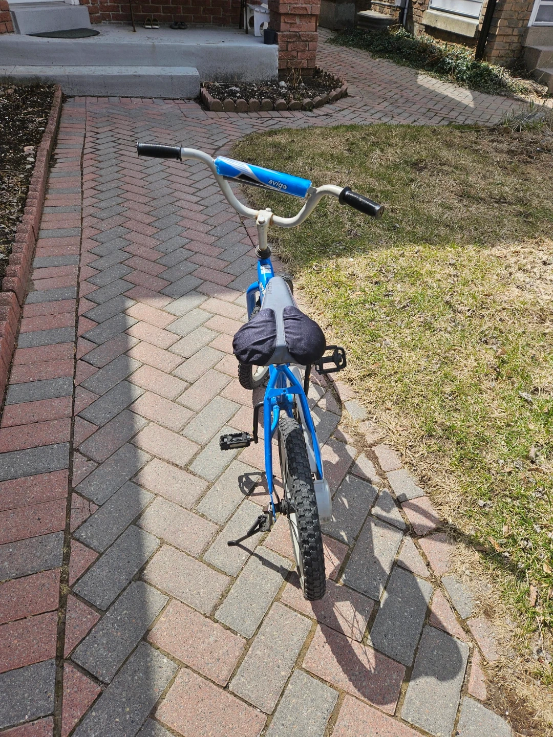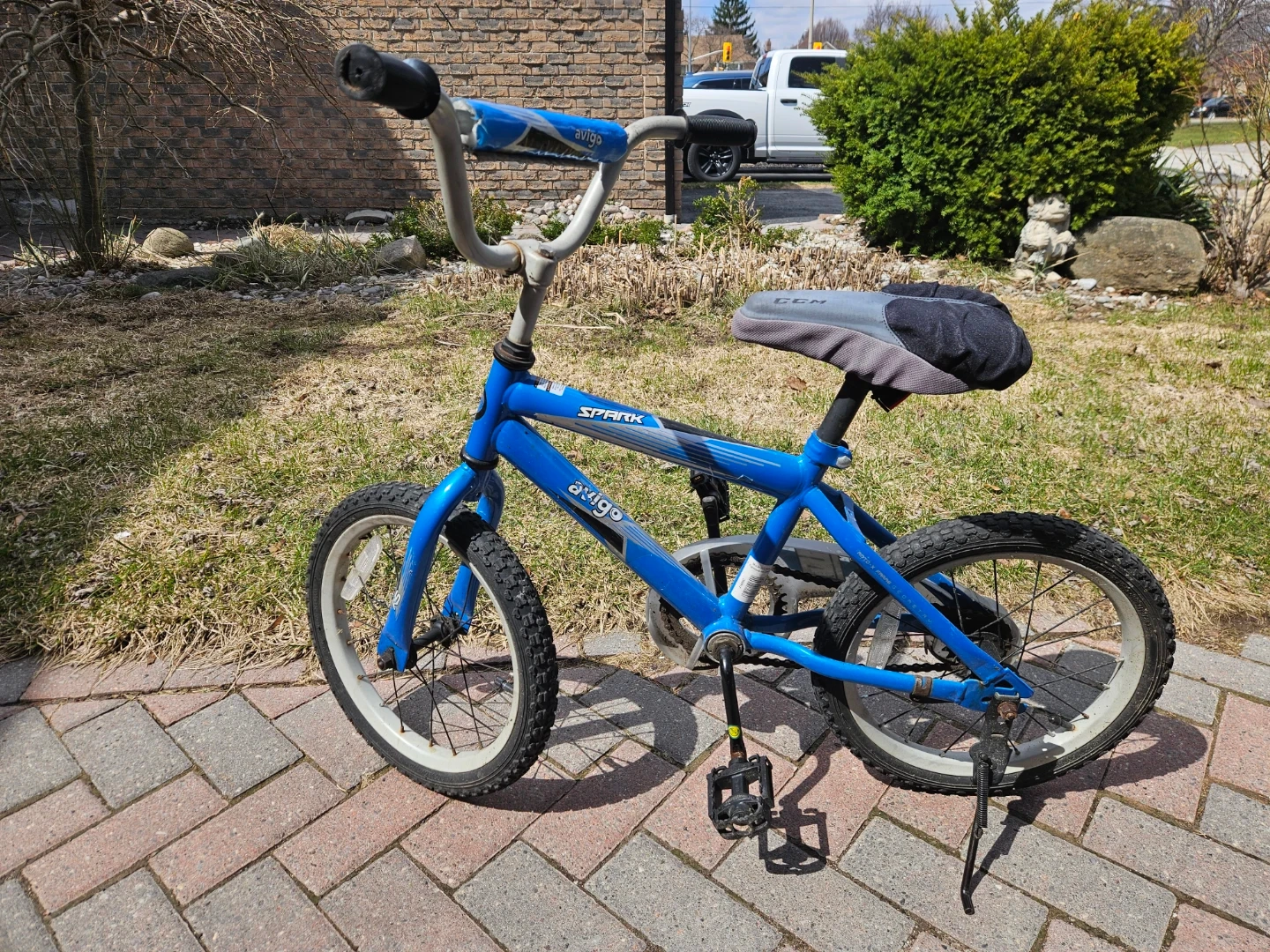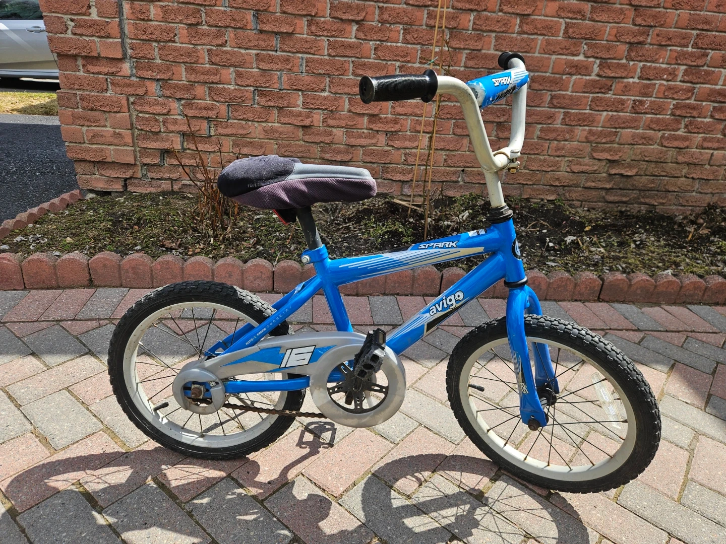 This is a blue Avigo Spark kids bike. It has a sturdy frame and easy-to-grip handlebars. It's a great starter bike for learning to ride!