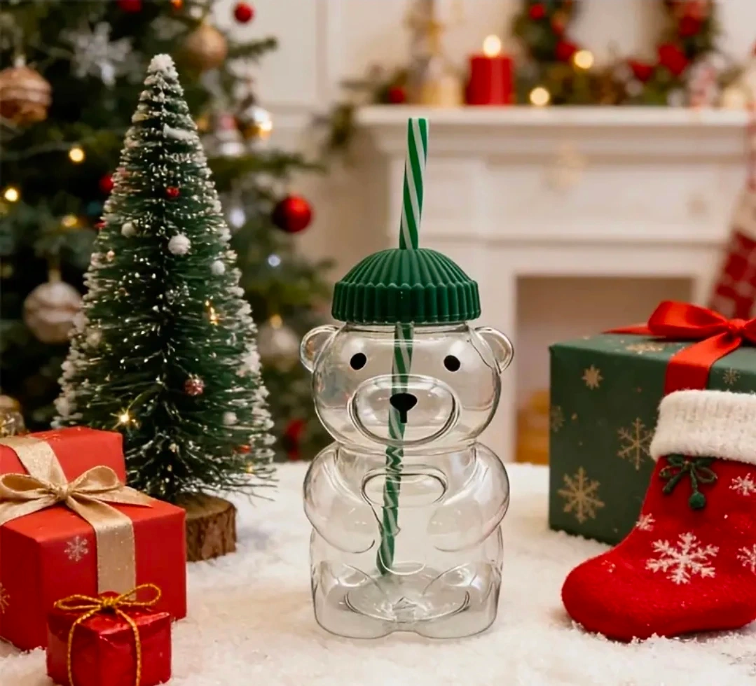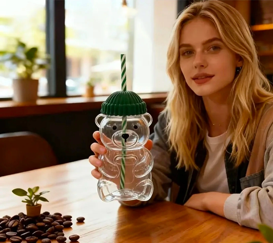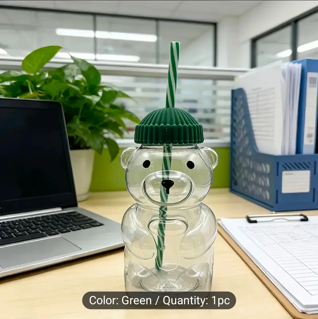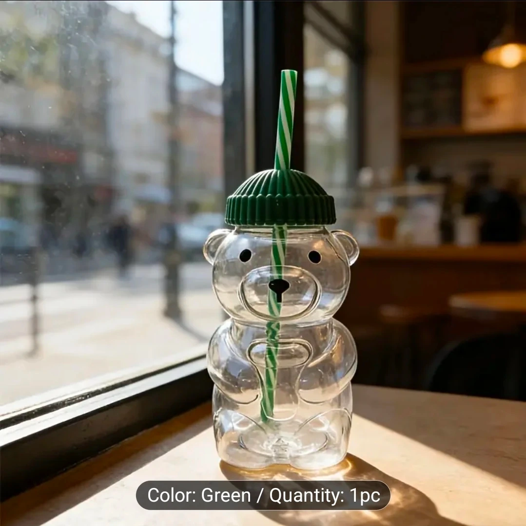 Super cute bear-shaped water bottle Glass with a green lid and straw! Perfect for anyone who loves a fun way to stay hydrated. The bottle is clear so you can easily see how much water you've had. Great for school, work, or just hanging out