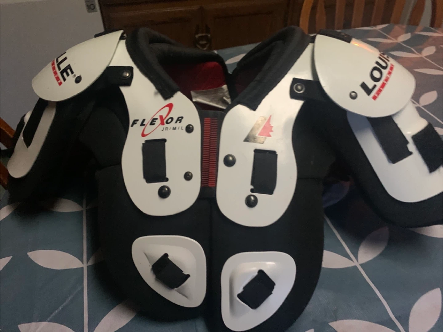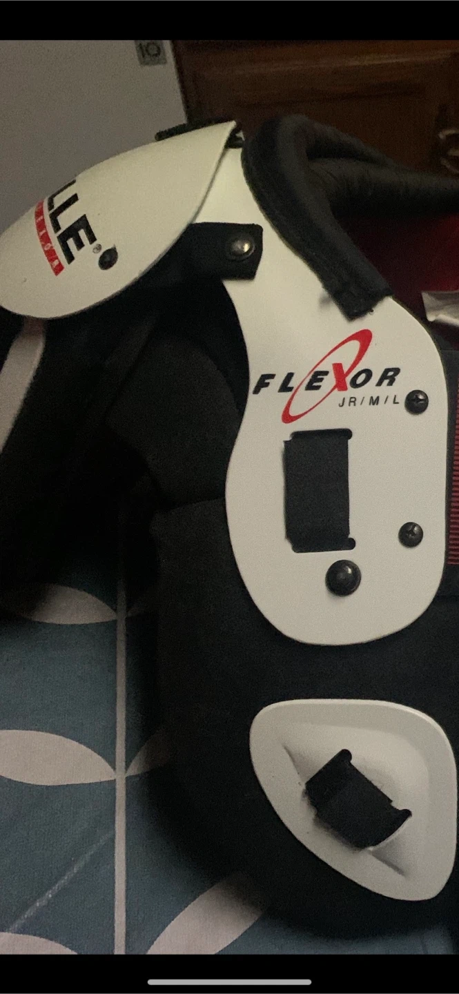 Louisville Flexor shoulder pads designed for youth players. Black and white colour scheme with red accents. Adjustable straps for a secure fit. Offers protection for various sports. Great condition. Hardly worn.