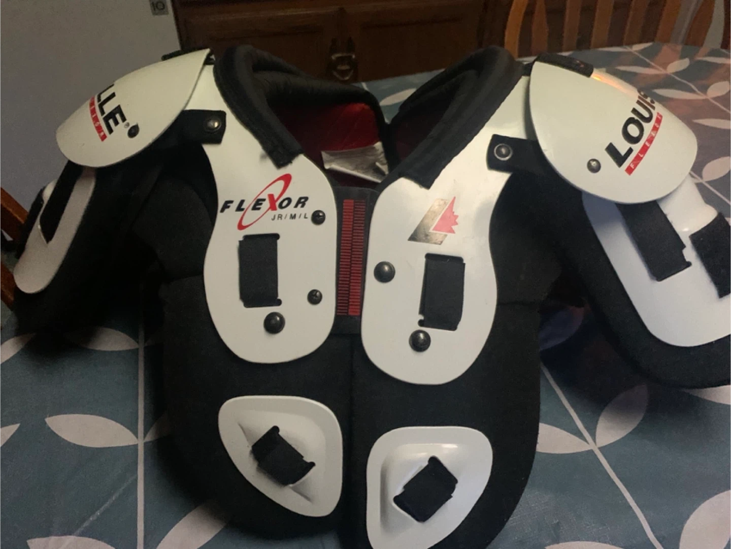 Louisville Flexor shoulder pads designed for youth players. Black and white colour scheme with red accents. Adjustable straps for a secure fit. Offers protection for various sports. Great condition. Hardly worn.