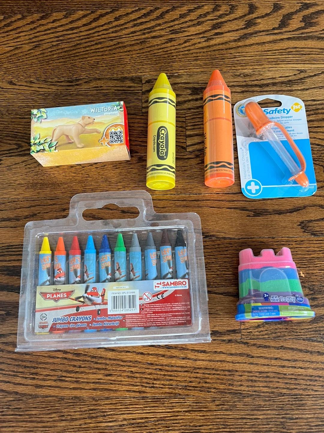 Assortment of children's art supplies. Includes Crayola crayons, Sambro jumbo crayons (Planes theme), Wiltopia animal figurine, and kinetic sand. Also features a medicine dropper.