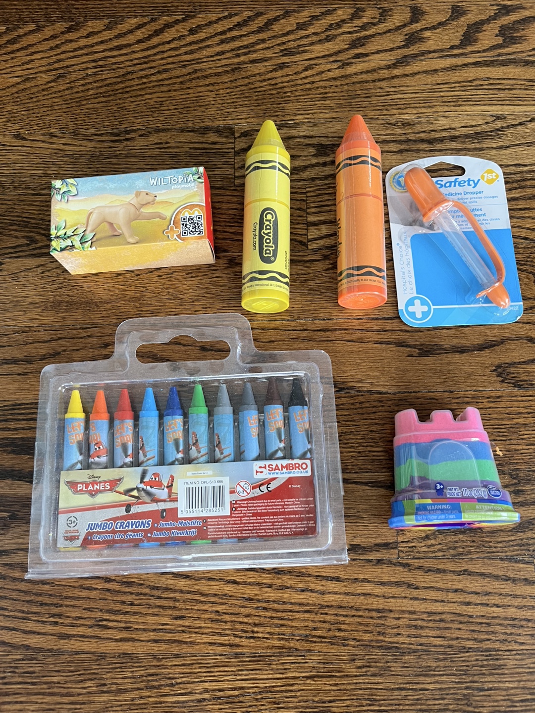 Assortment of children's art supplies. Includes Crayola crayons, Sambro jumbo crayons (Planes theme), Wiltopia animal figurine, and kinetic sand. Also features a medicine dropper.