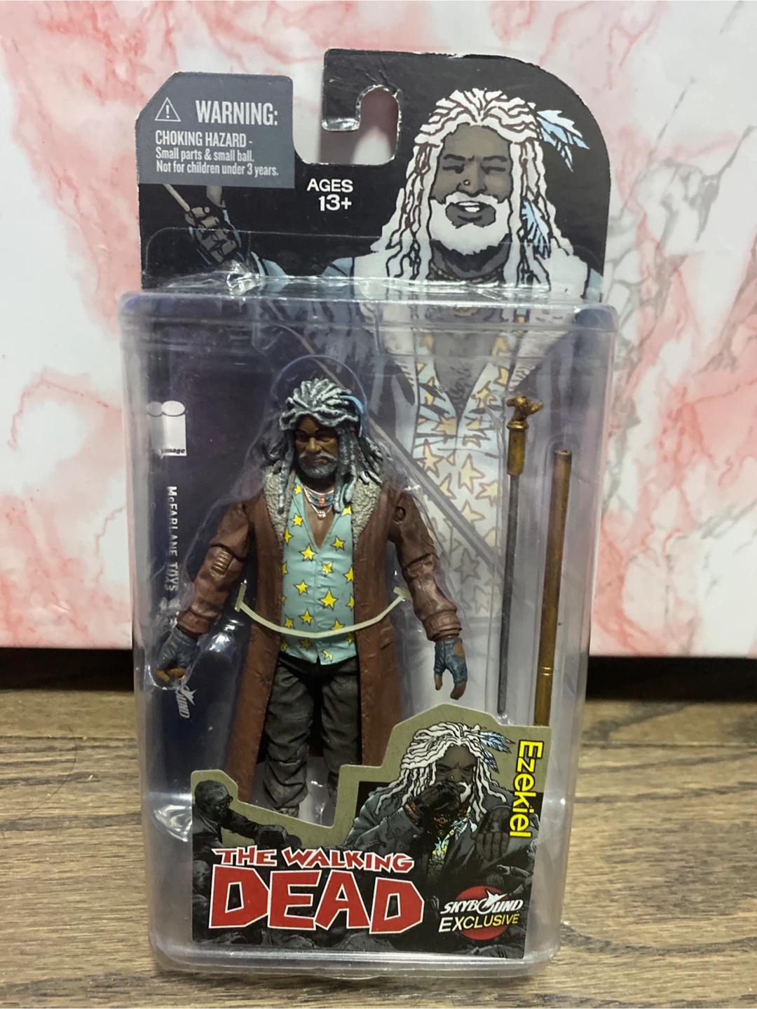 Selling a The Walking Dead Ezekiel action figure by McFarlane Toys. This limited edition figure, exclusively from Skybound Entertainment, includes Ezekiel's walking staff that conceals a sword. It's suitable for ages 13 and up. A great addition to any Walking Dead collection!