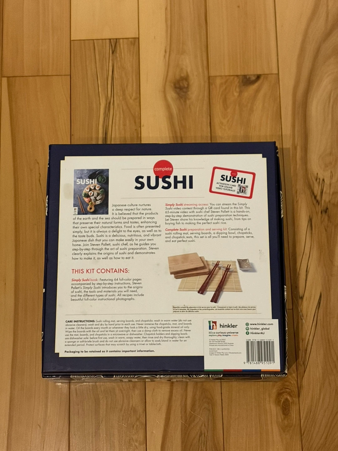 This kit contains a complete sushi book featuring 64 full-colour pages and a sushi preparation and serving kit. It includes a bamboo mat, two pairs of chopsticks, and a rice paddle. Learn to make your own delicious sushi dishes! Never been used.